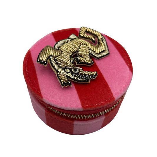 Jewellery Travel Pot in pink stripe - Crocodile brooch