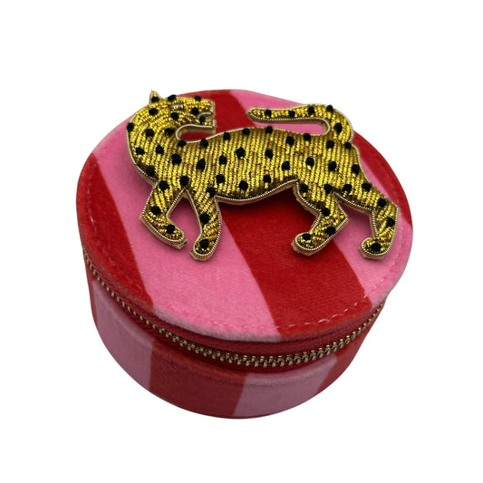 Jewellery Travel Pot in pink stripe - Leopard brooch