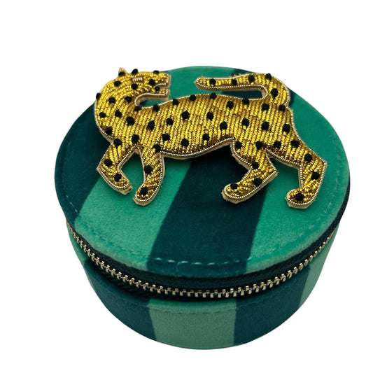 Jewellery Travel Pot in teal stripe - Leopard brooch