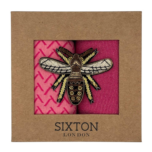 Pink Barcelona & Red Berlin sock box duo with embroidered brooch