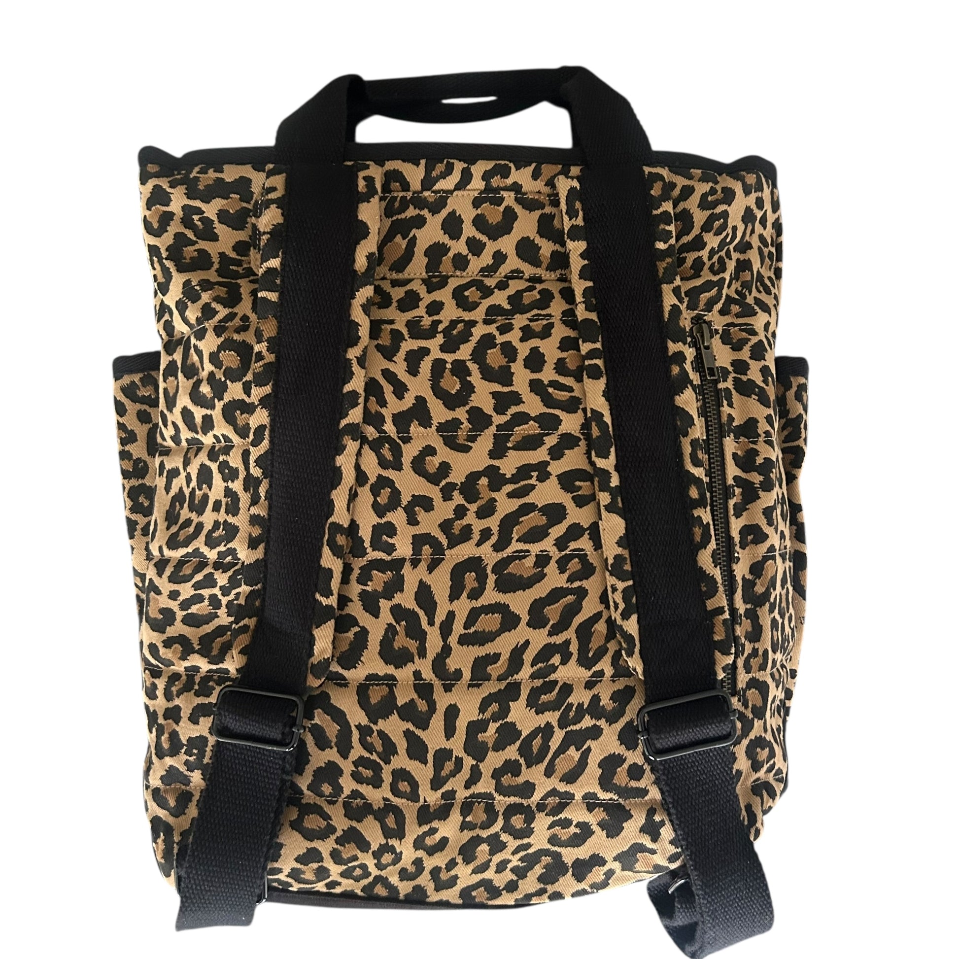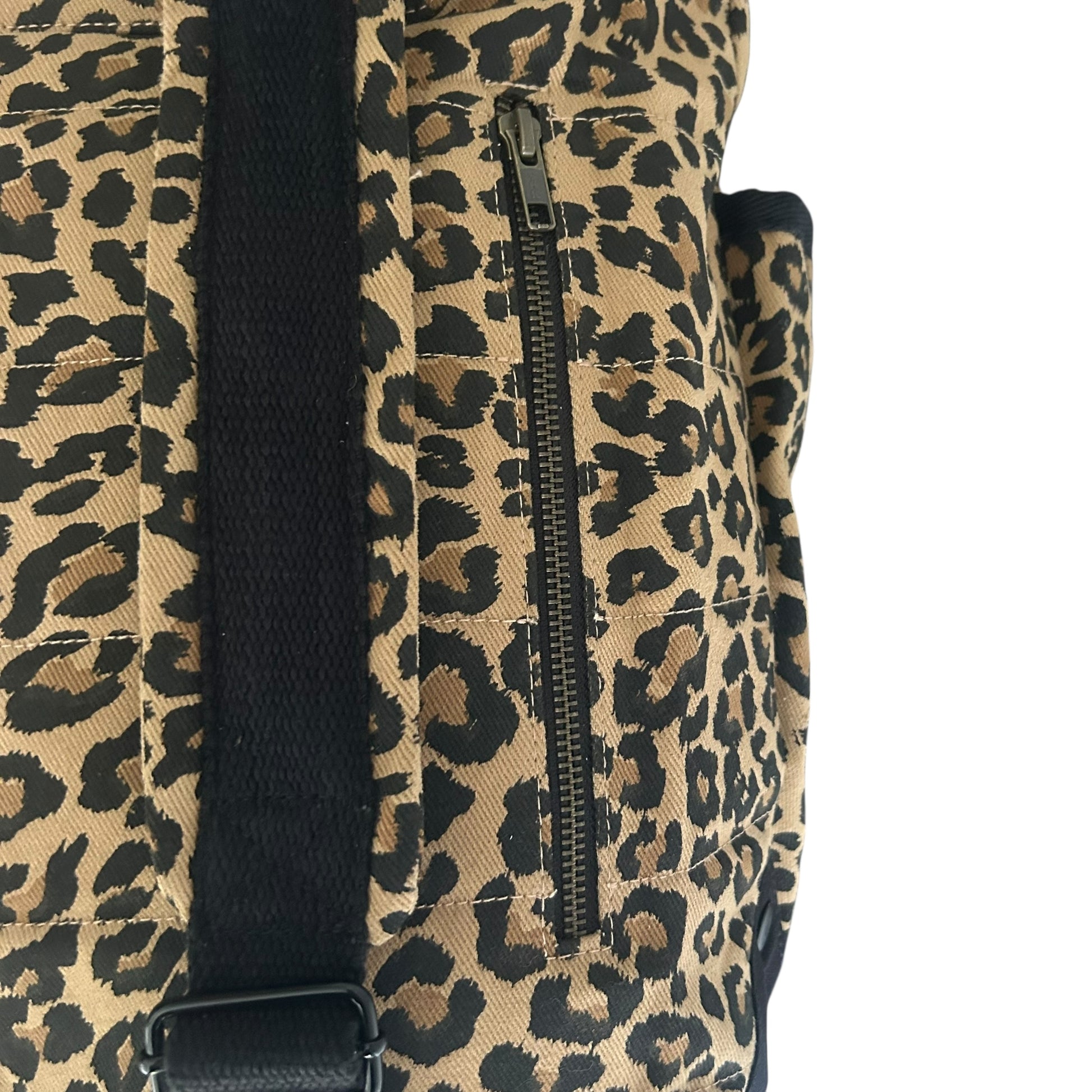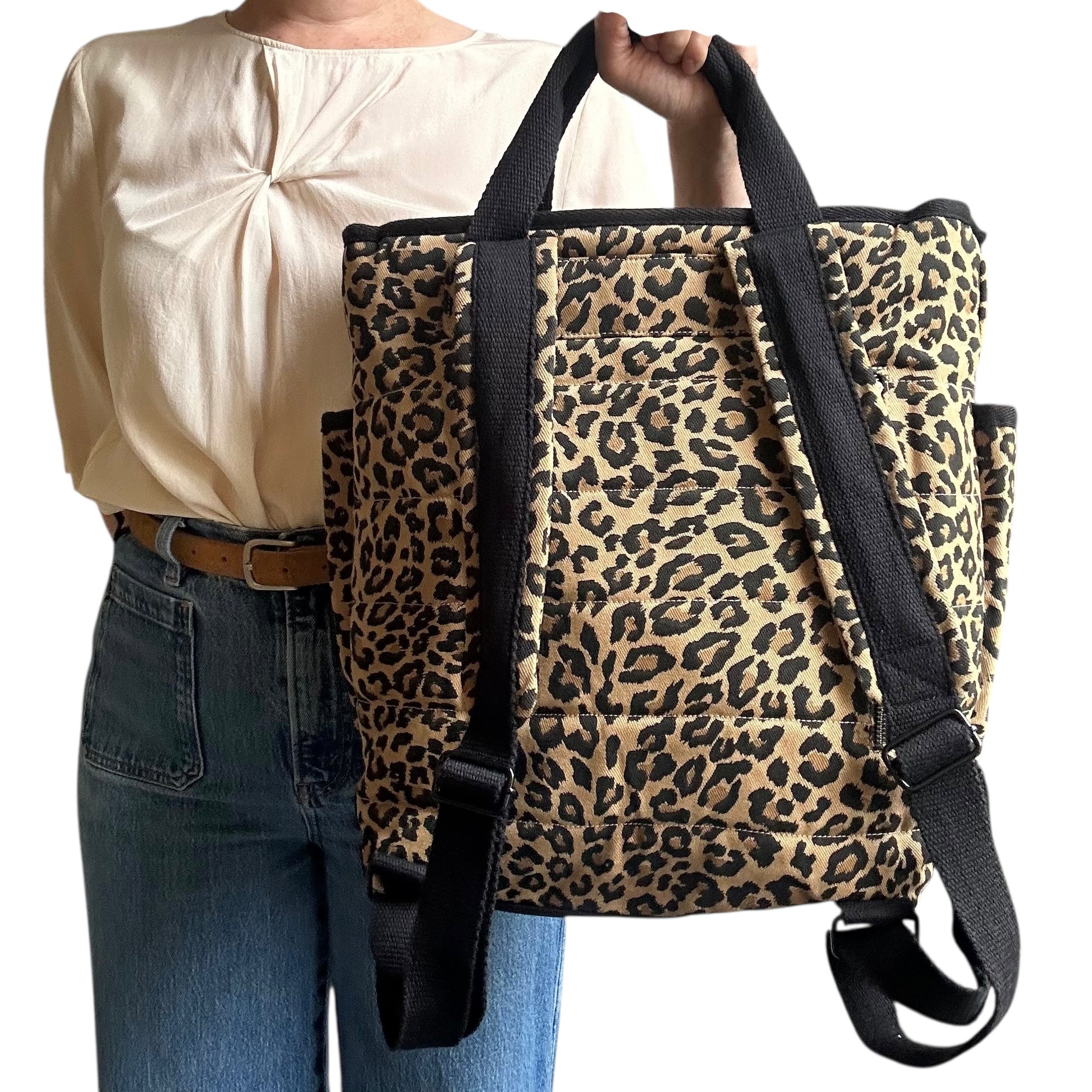 A statement backpack in a striking,sand leopard print, made from recycled cotton.
