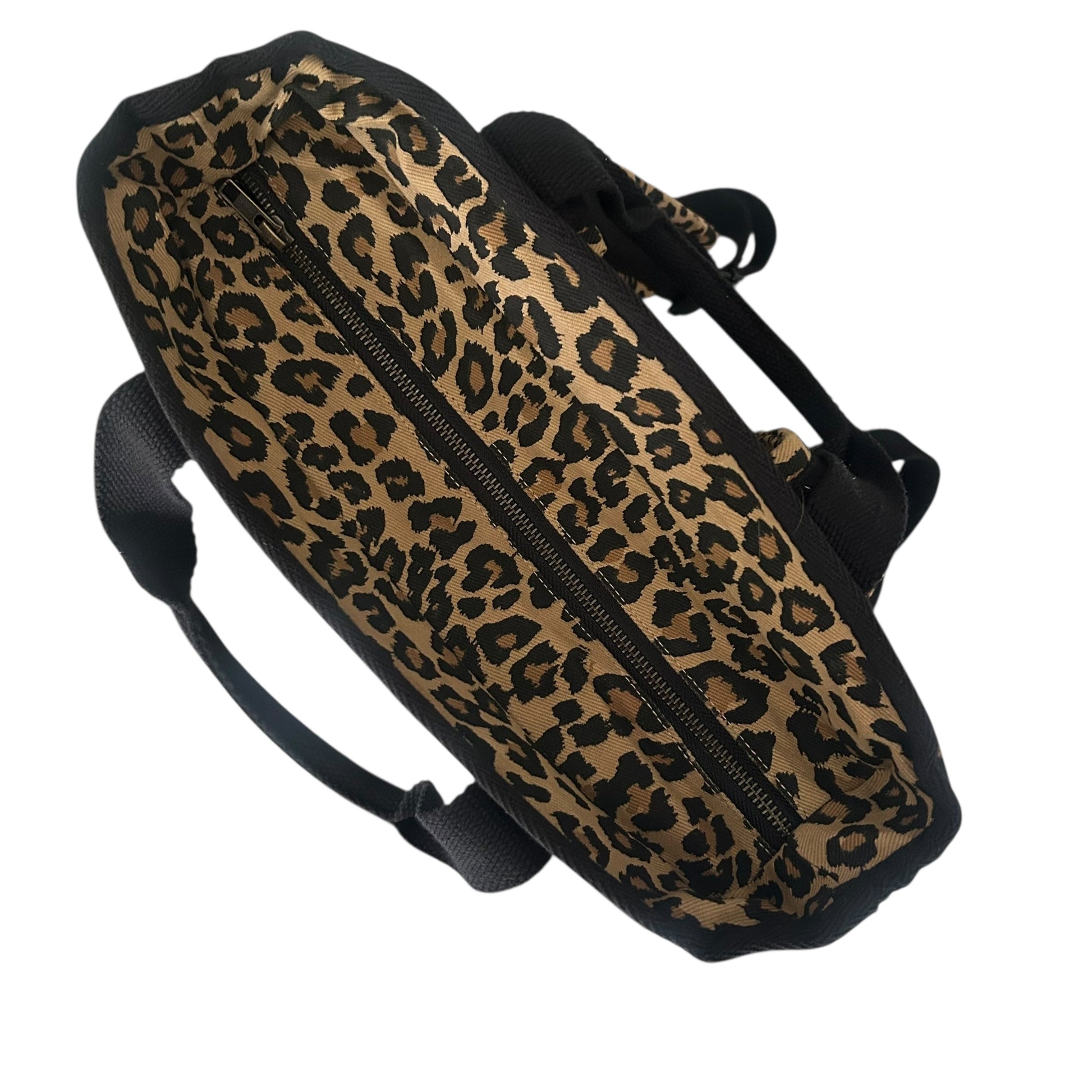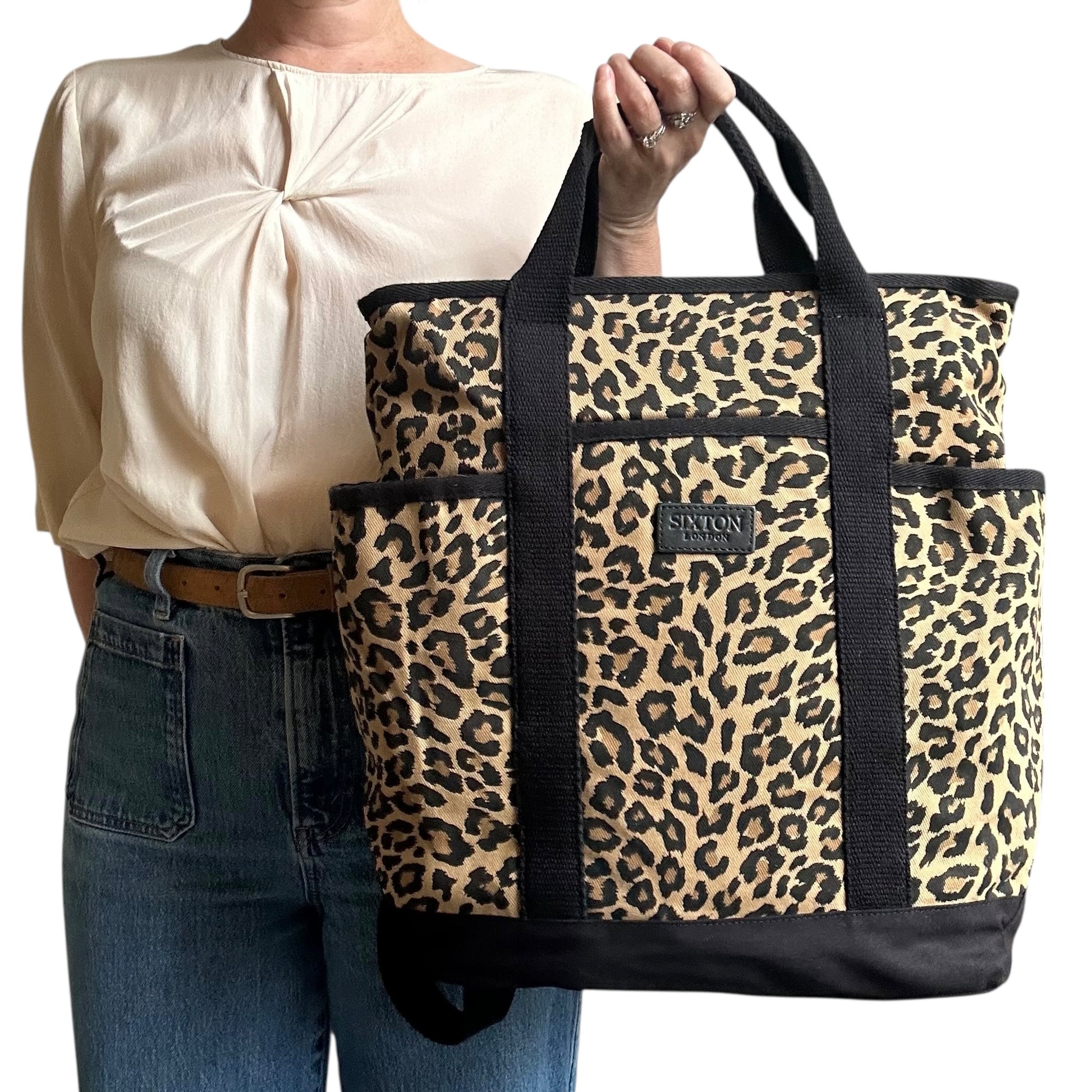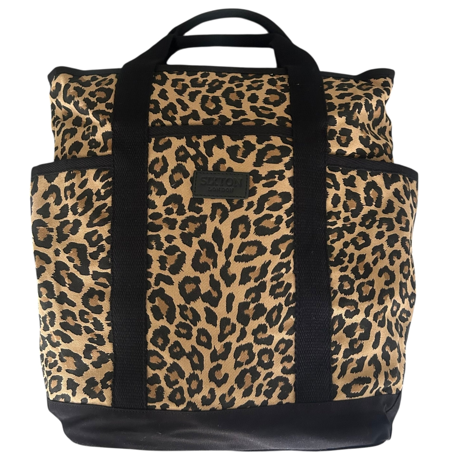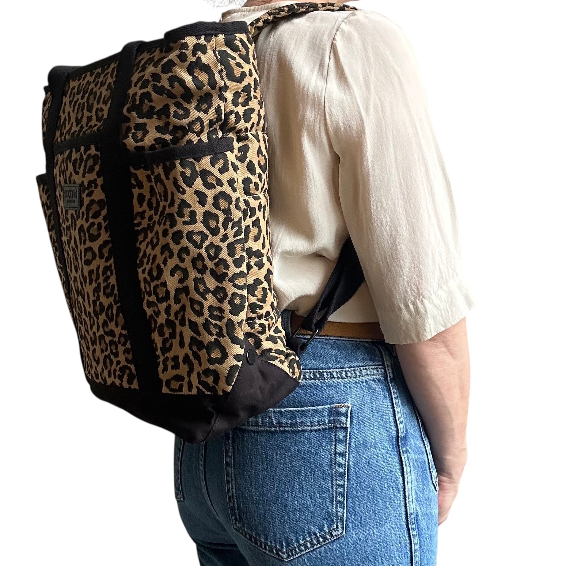 A statement backpack in a striking,sand leopard print, made from recycled cotton.