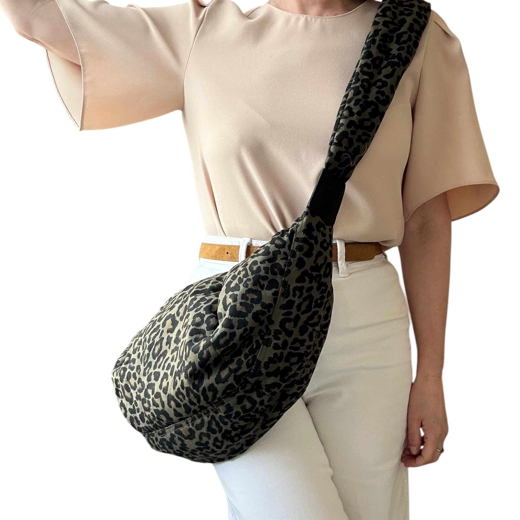 The Brixton bag - our best selling sling bag / cross body bag in a dark green leopard print, made from recycled cotton. Also available in small.