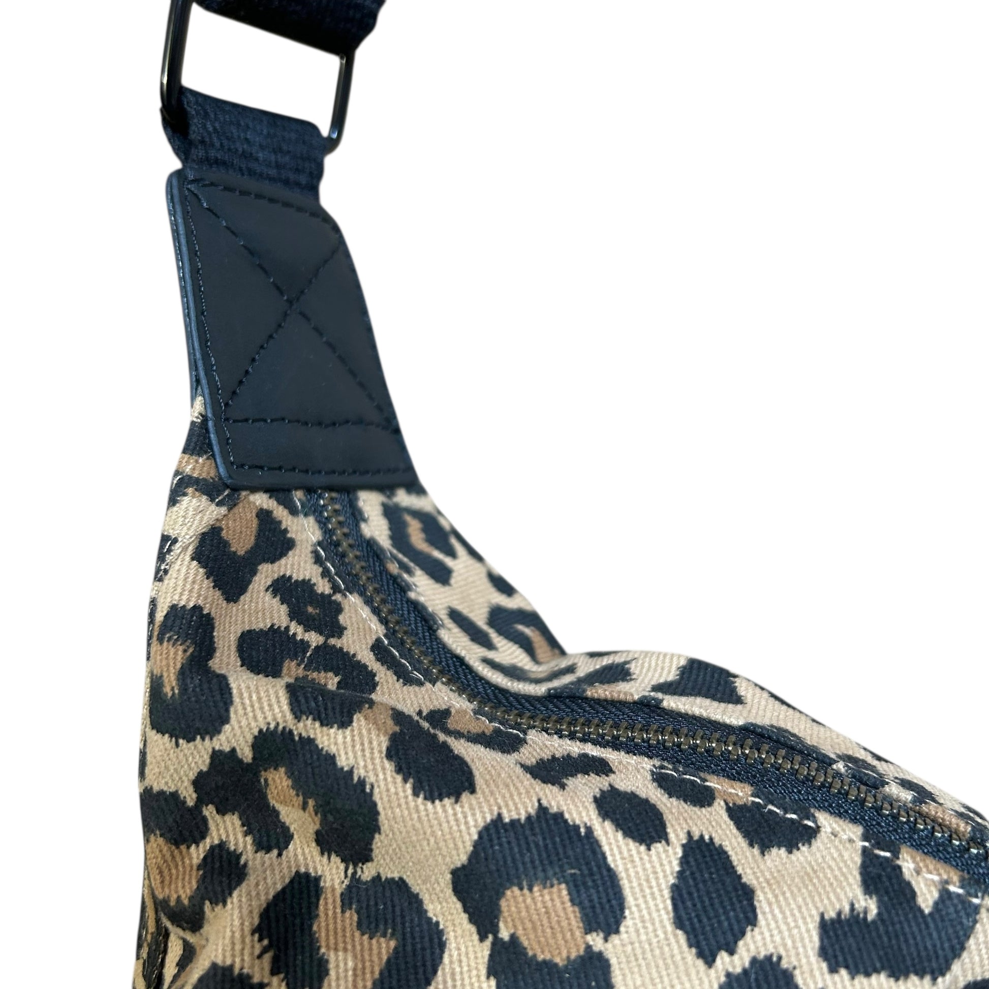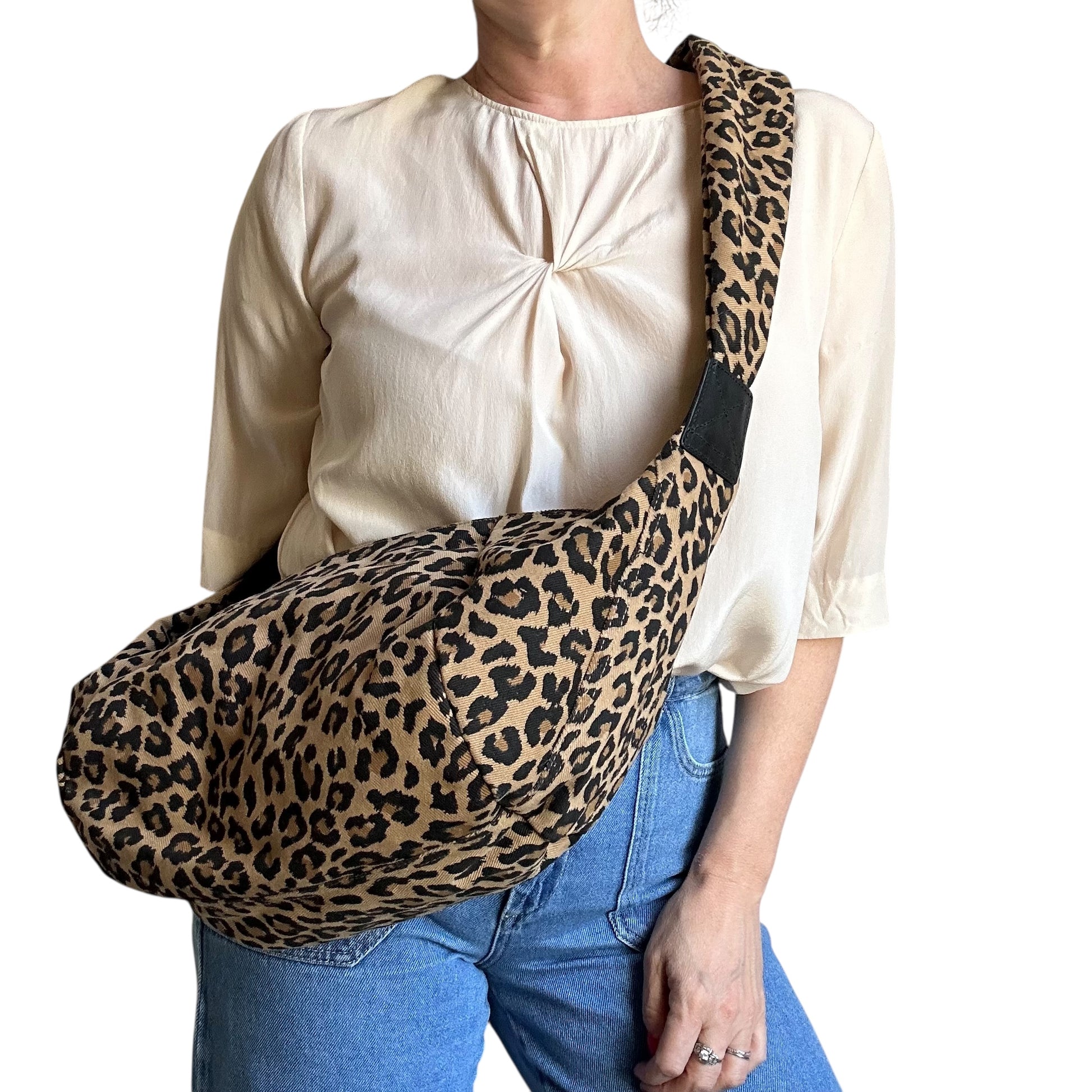 The Brixton bag - a stylish sling bag / cross body style bag in a lighter, sand coloured leopard print, made from recycled cotton. Also available in small.