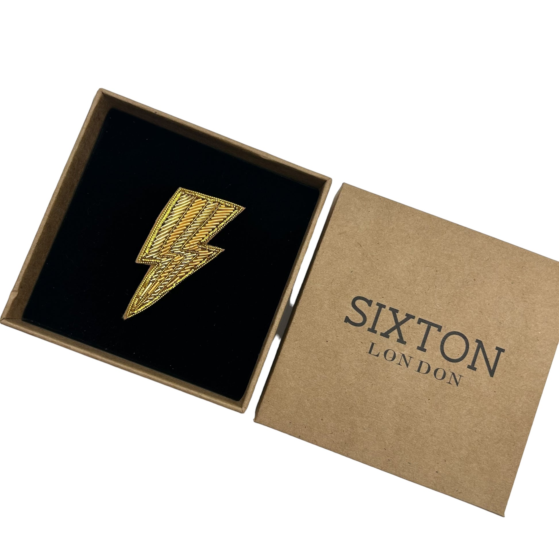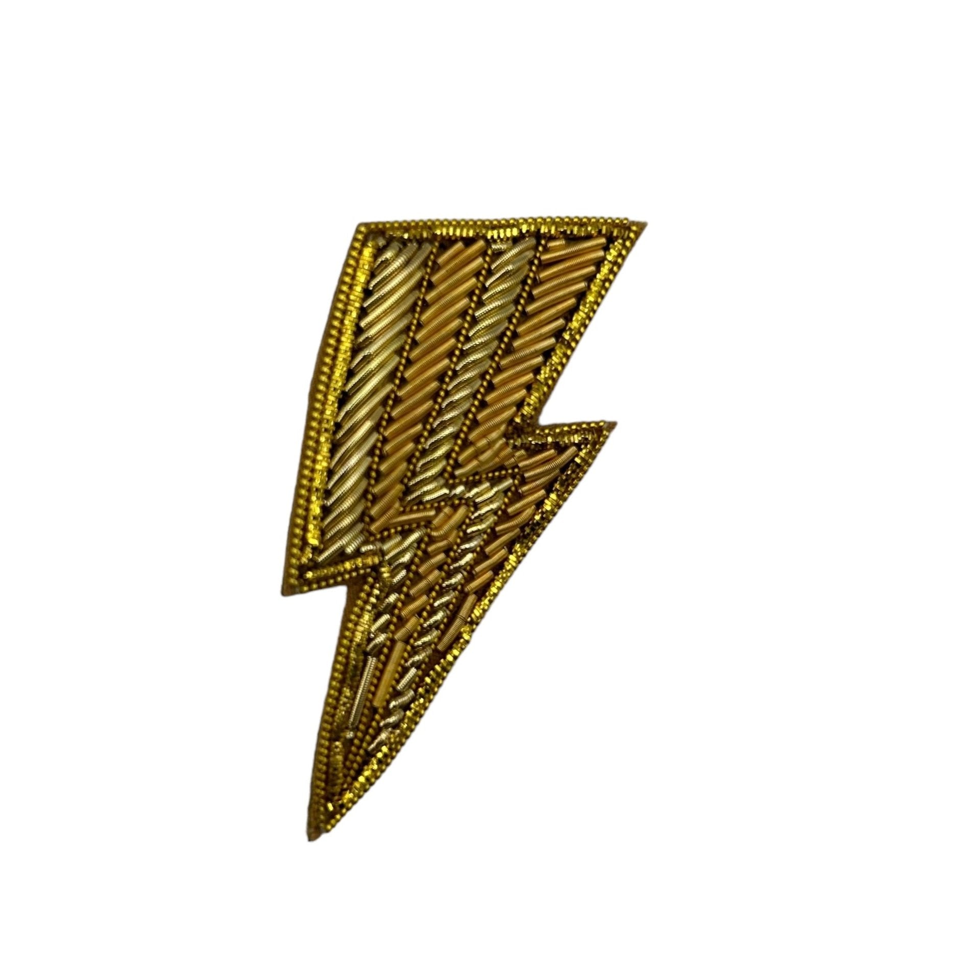 Rock our latest lightning bolt! An embroidered golden lightning bolt brooch. Hand embroidered with gold-glitter thread.