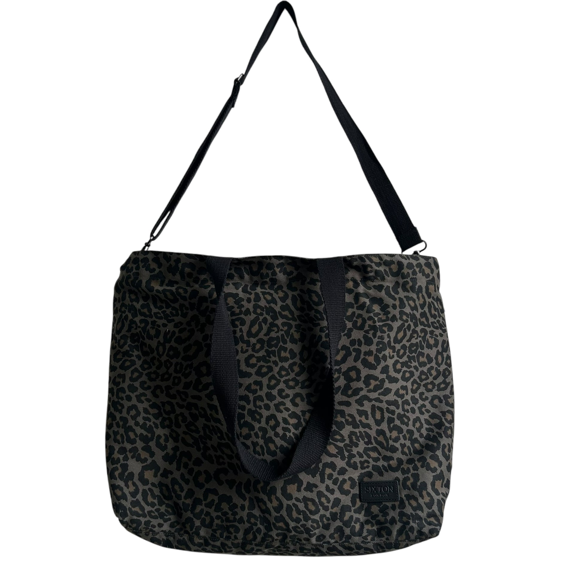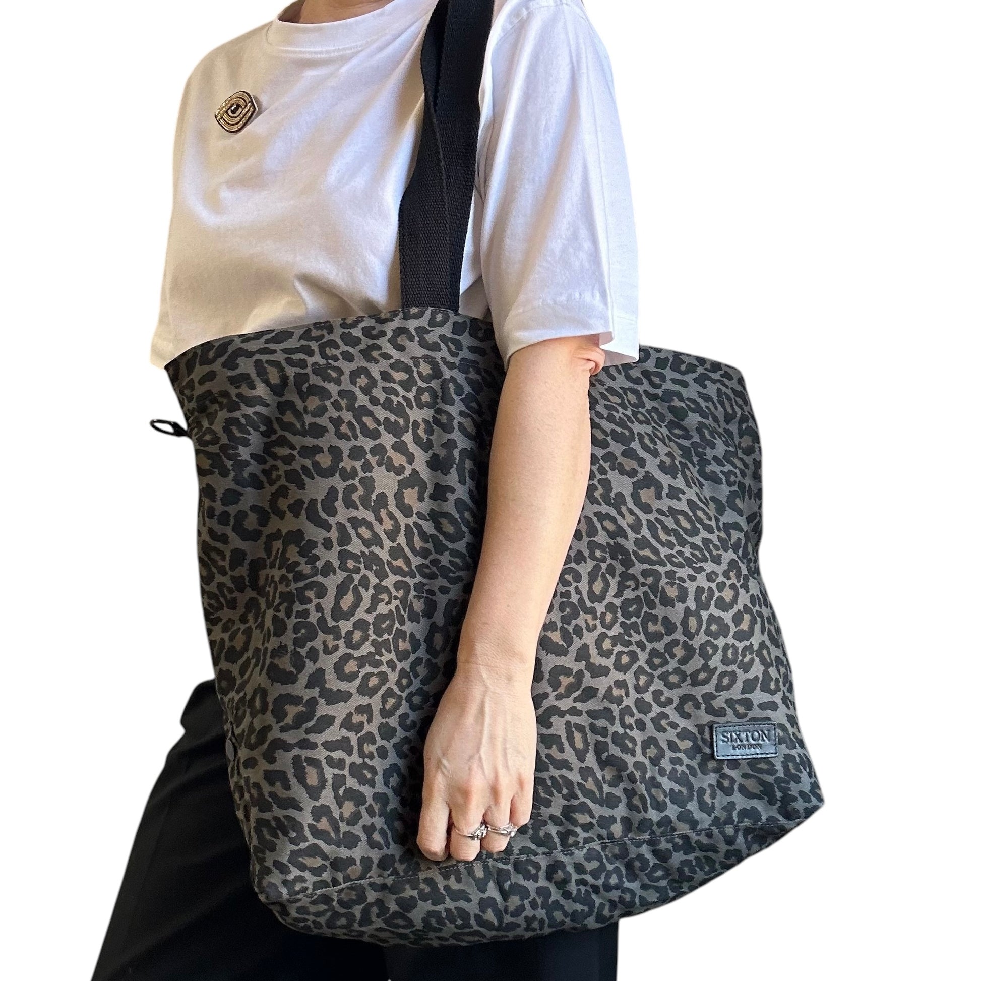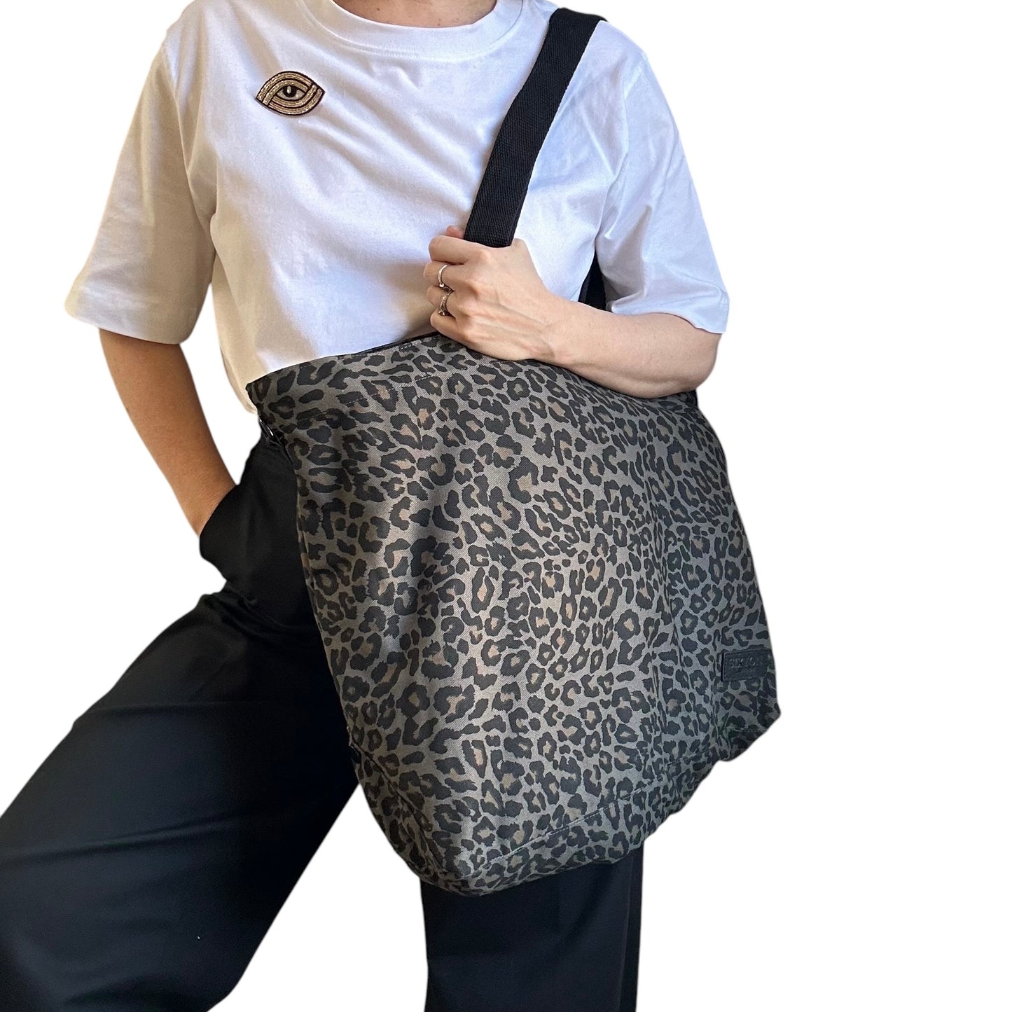 A large, stylish, charcoal grey leopard print tote bag with a main zip.