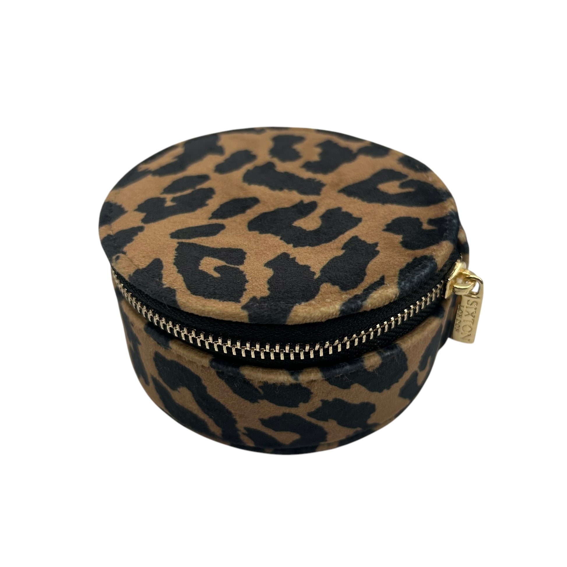 A gorgeous jewellery travel pot in luxurious leopard print, made from recycled materials.