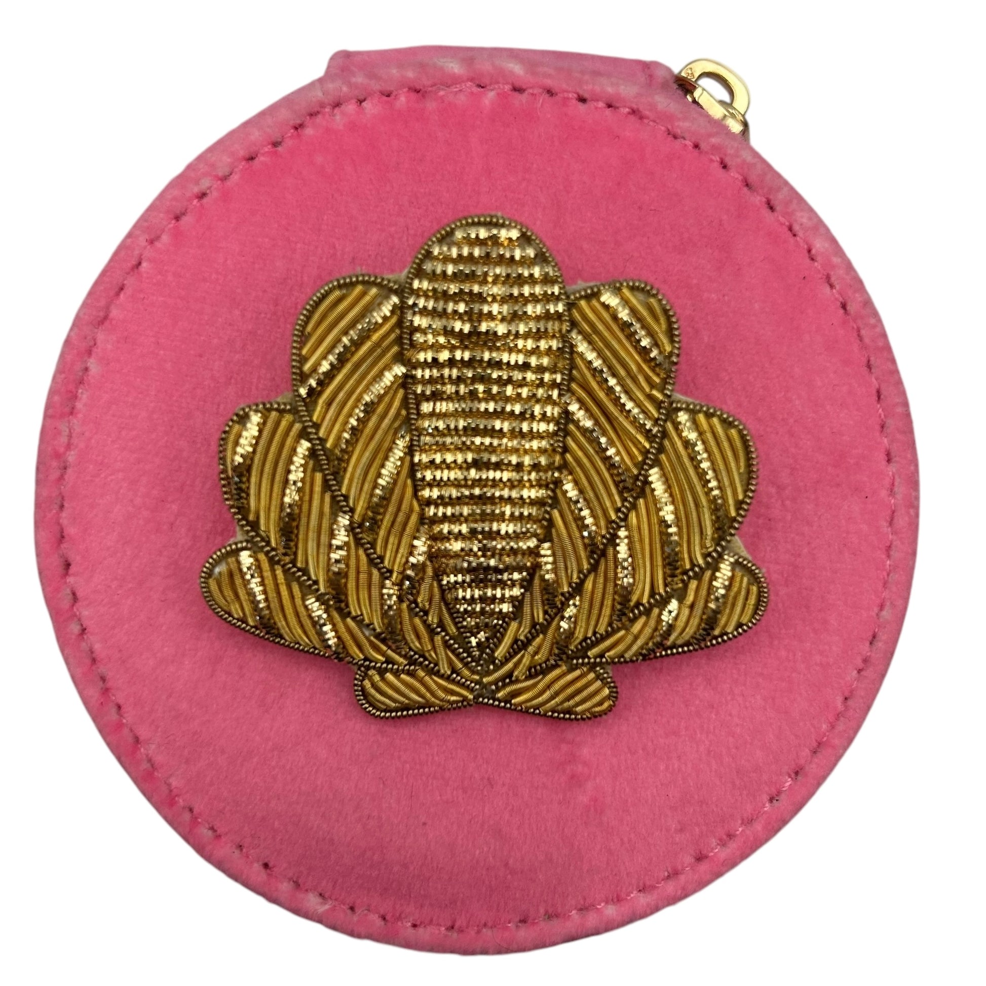 A cute little jewellery travel pot in pale pink, made from recycled materials, with a detachable hand embroidered brooch.