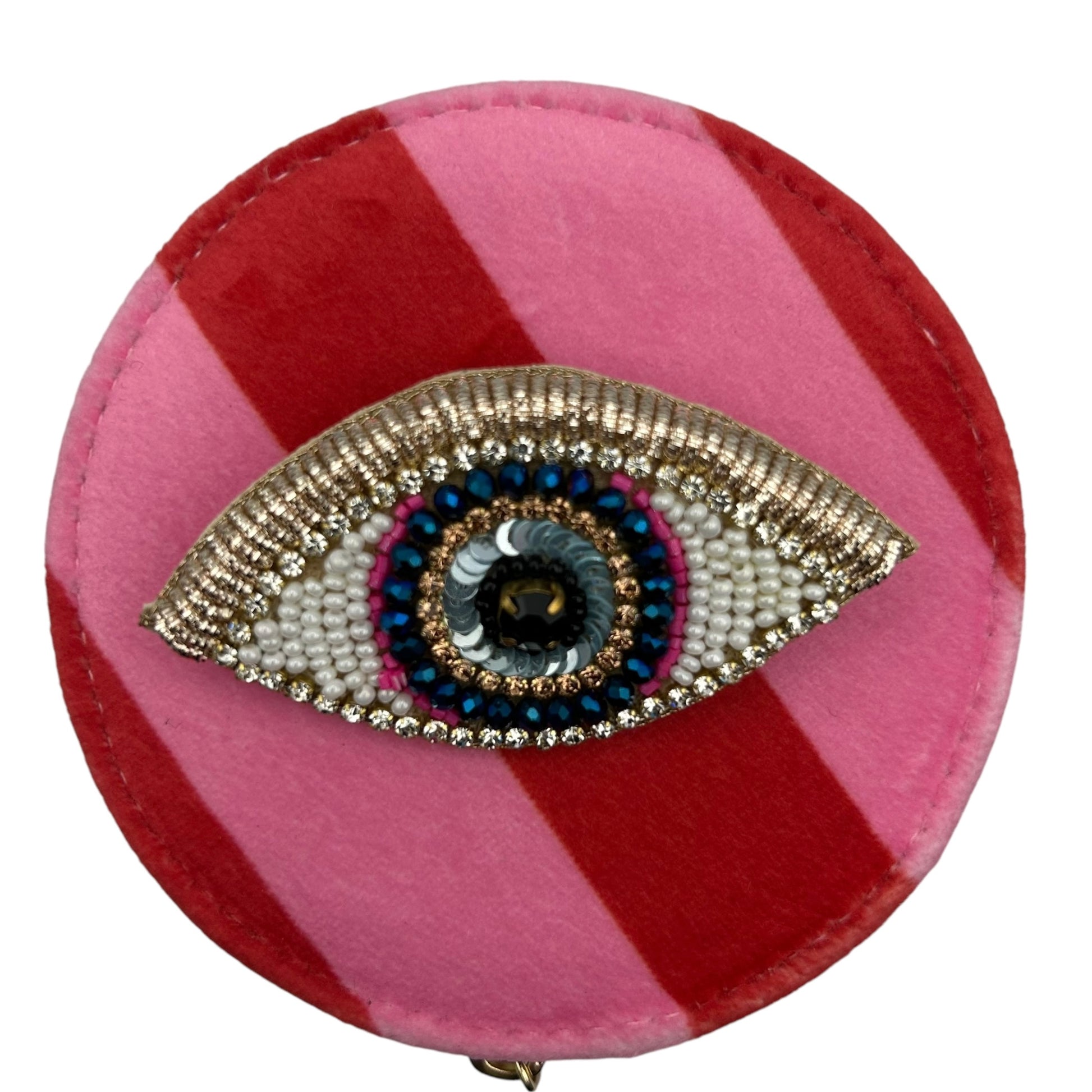 A gorgeous striped jewellery travel pot, made from recycled materials, with a hand embroidered golden eye brooch.