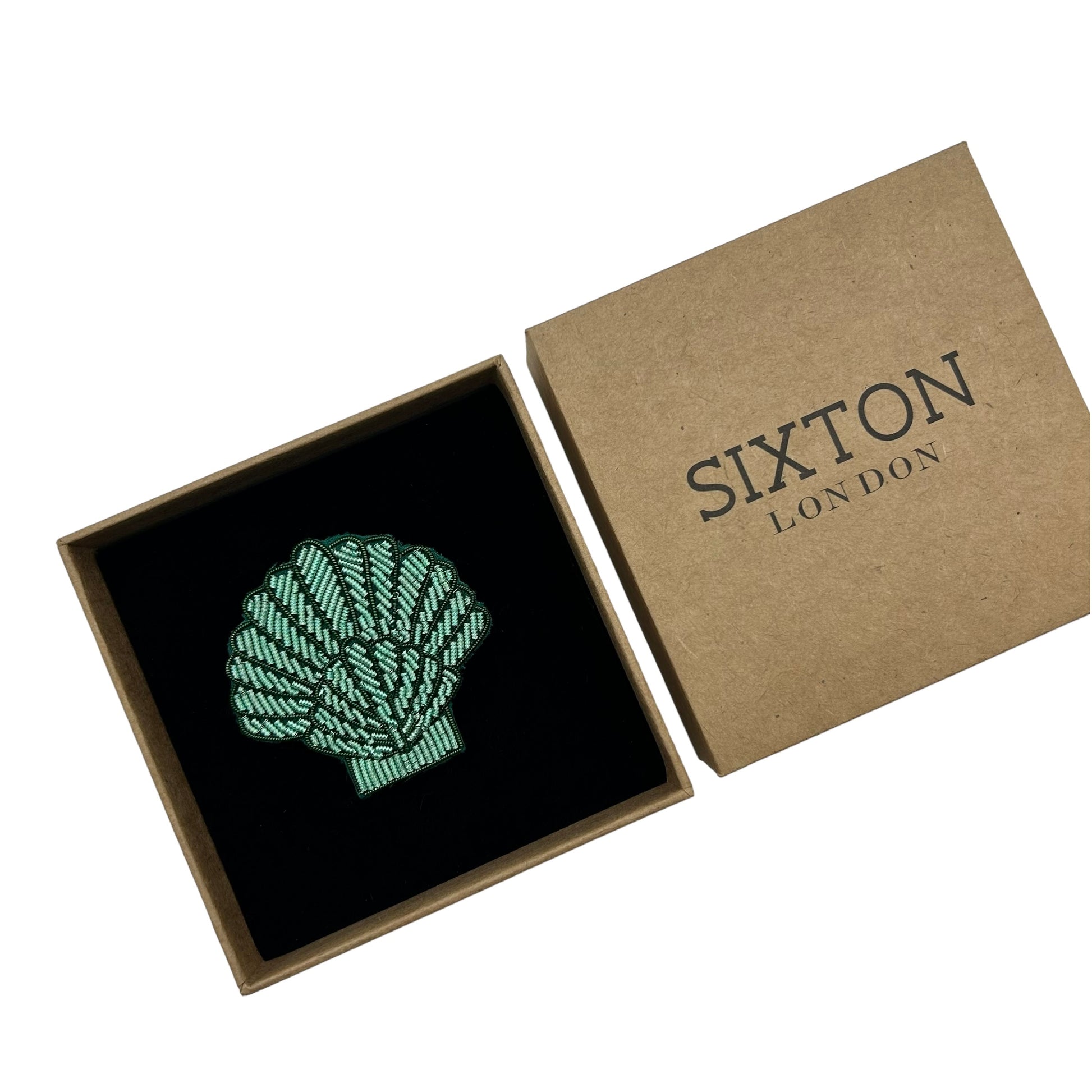 An embroidered, mint shell brooch. This beautiful pin measures 5cm across and 5cm from top to bottom.
