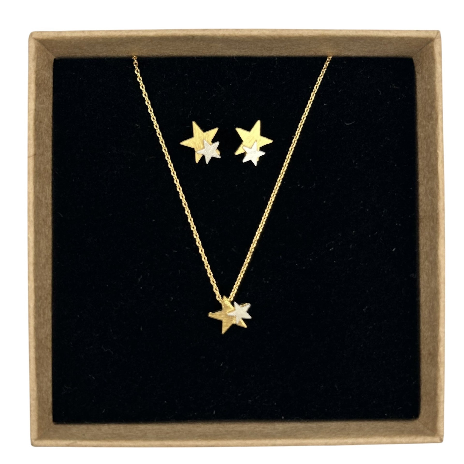 This set includes a double star pendant, on a brushed gold plated effect necklace, with matching earrings.