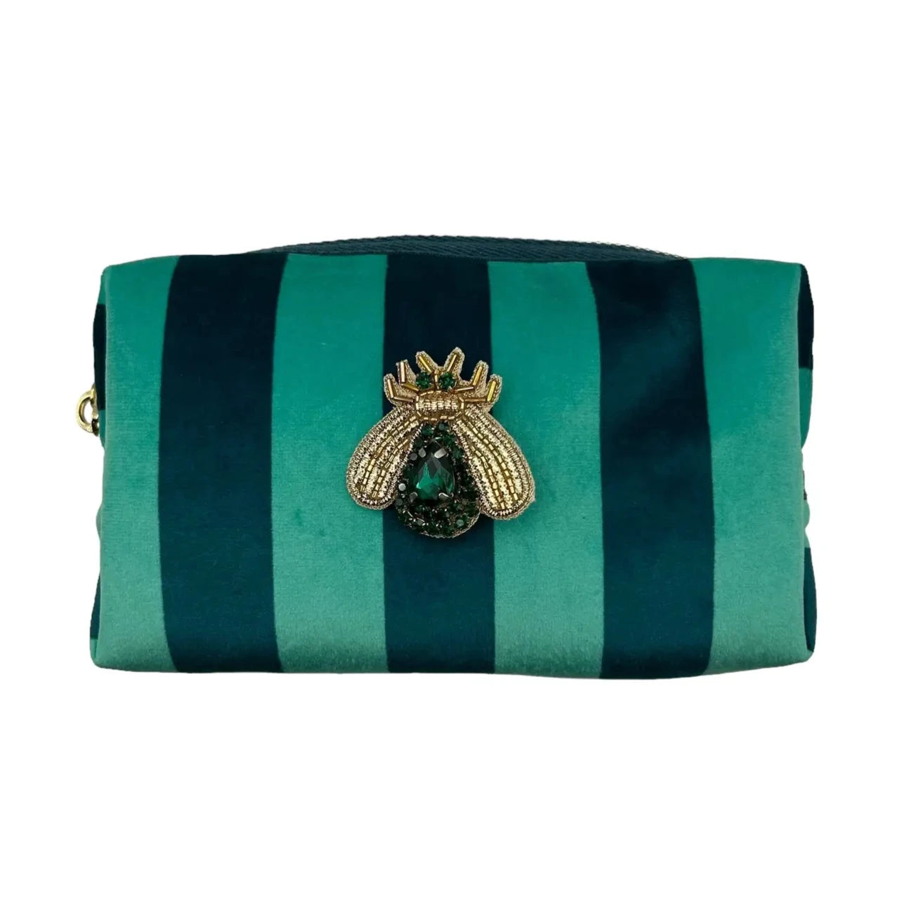 A gorgeous teal stripe velvet makeup bag, with a detachable Green Insect brooch.