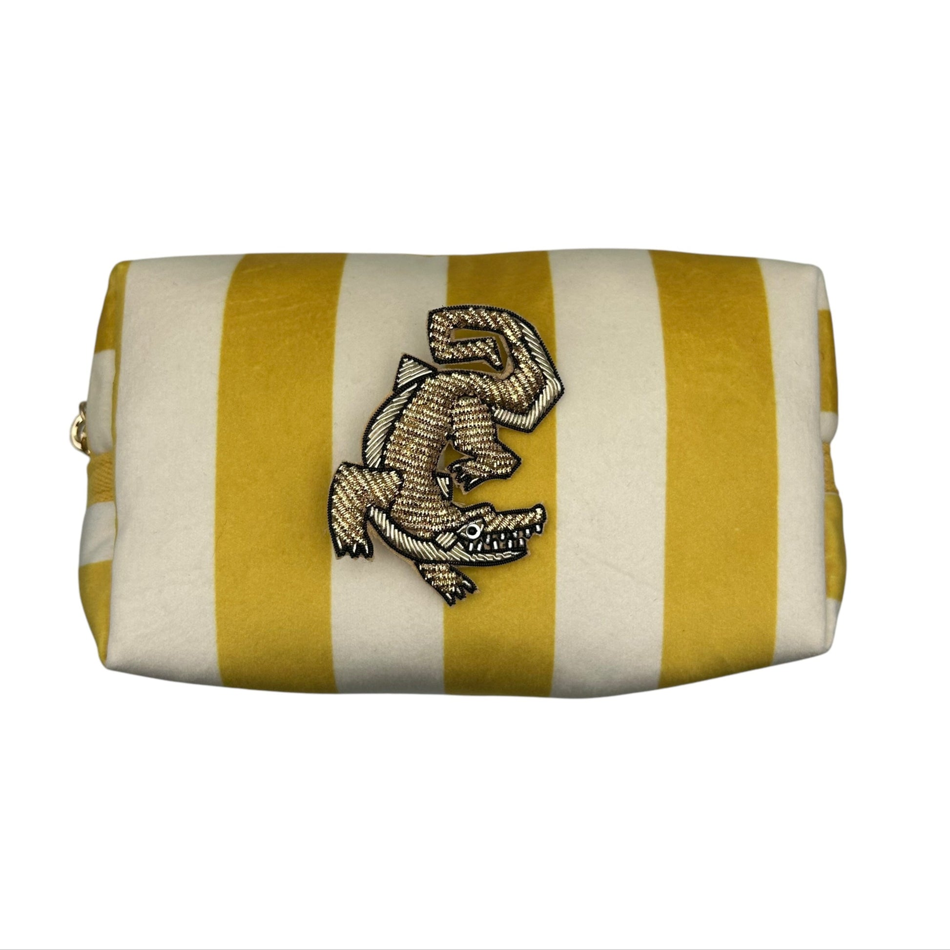 A gorgeous yellow and cream stripe velvet makeup bag, with a detachable Crocodile brooch.