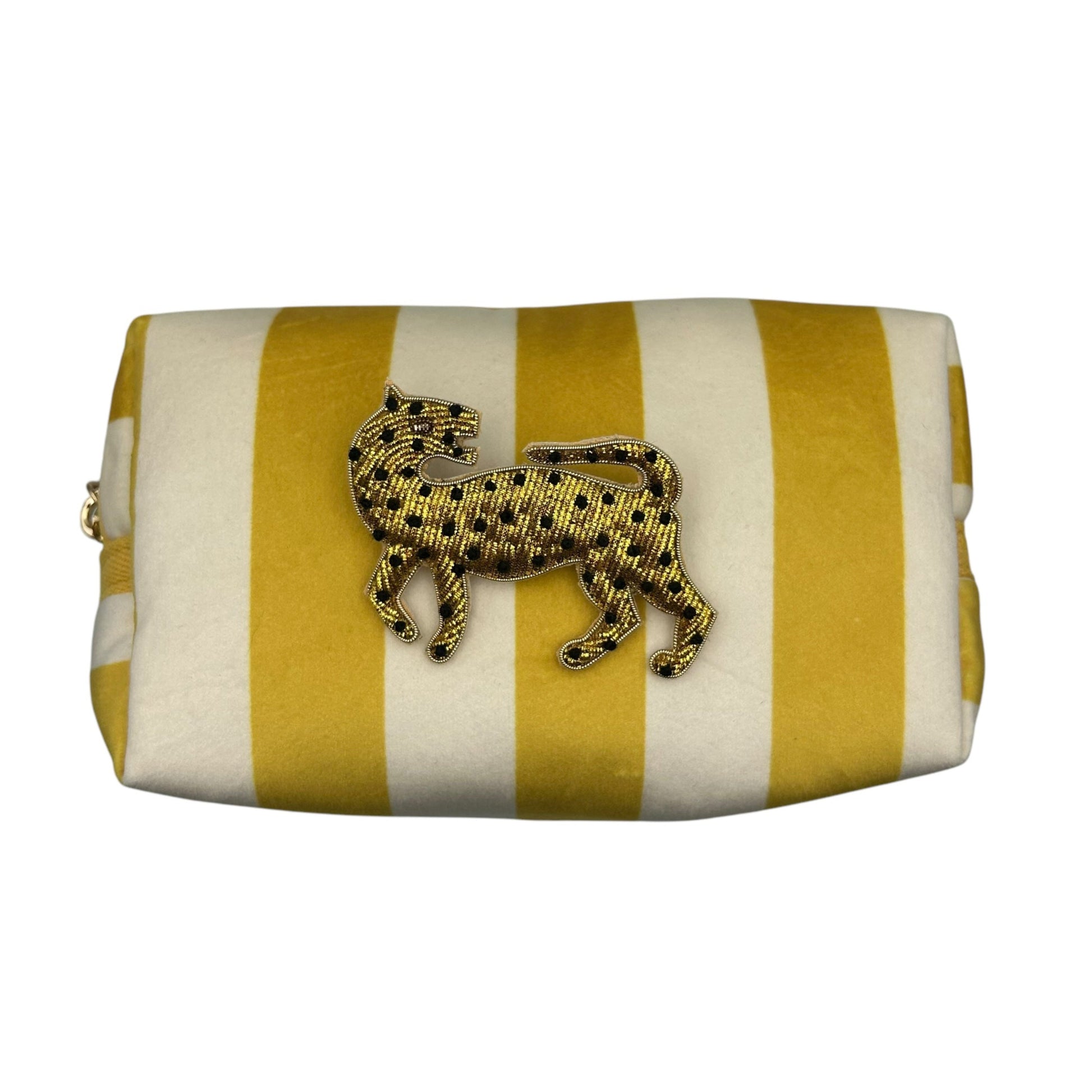 A gorgeous yellow and cream stripe velvet makeup bag, with a striking detachable Leopard brooch.