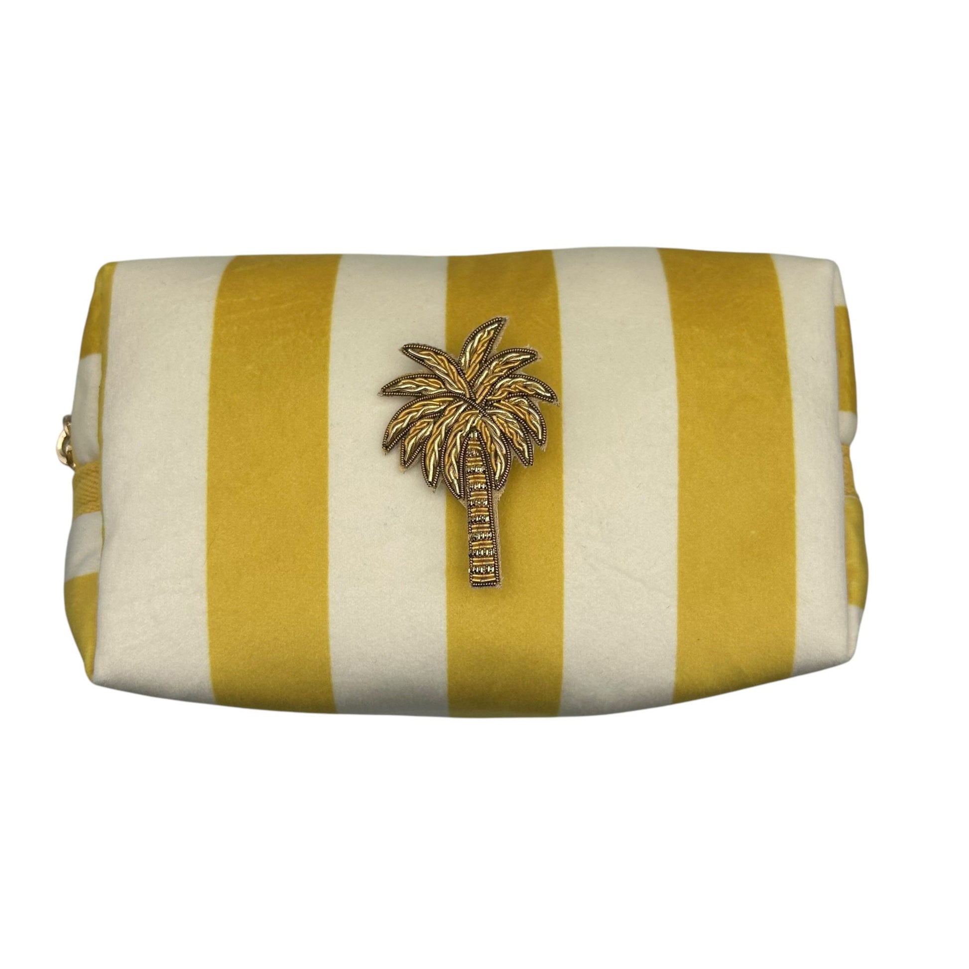 A gorgeous yellow and cream stripe velvet makeup bag, with a detachable Palm Tree brooch.
