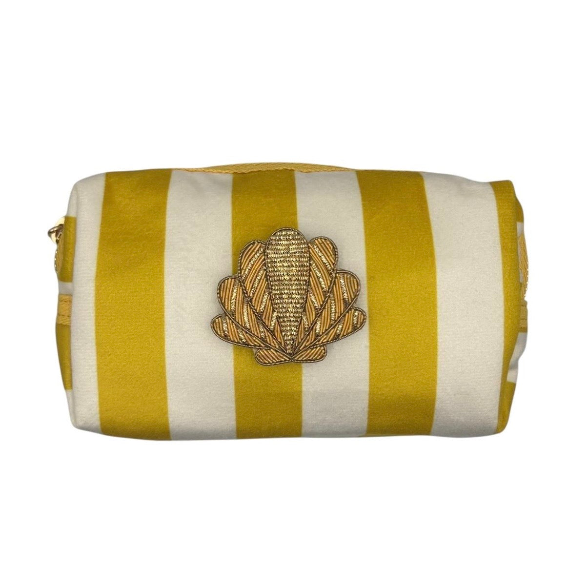 A gorgeous yellow and cream stripe velvet makeup bag, with a detachable Shell brooch.
