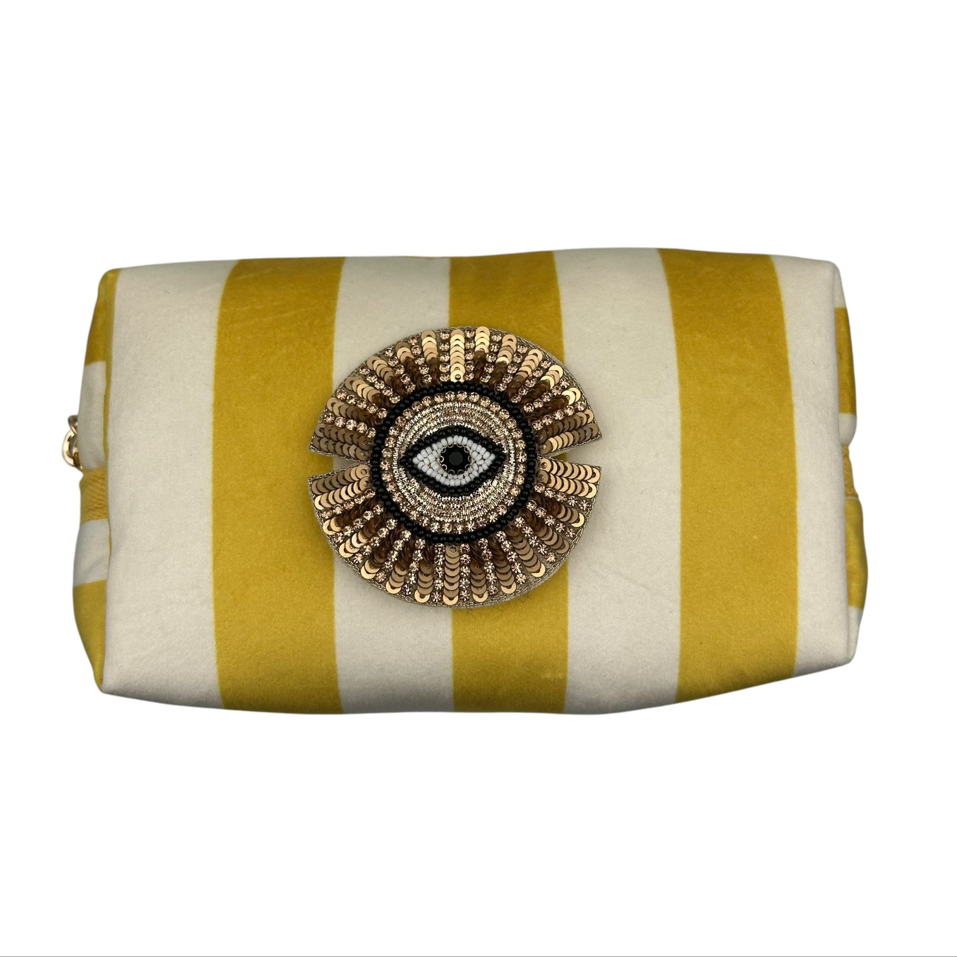 A gorgeous yellow and cream stripe velvet makeup bag, with a striking detachable Sunray Eye brooch.