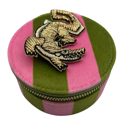 Jewellery Travel Pot in pink stripe - Crocodile brooch
