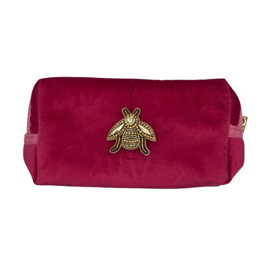 Bright pink makeup bag with Jewelled Insect brooch