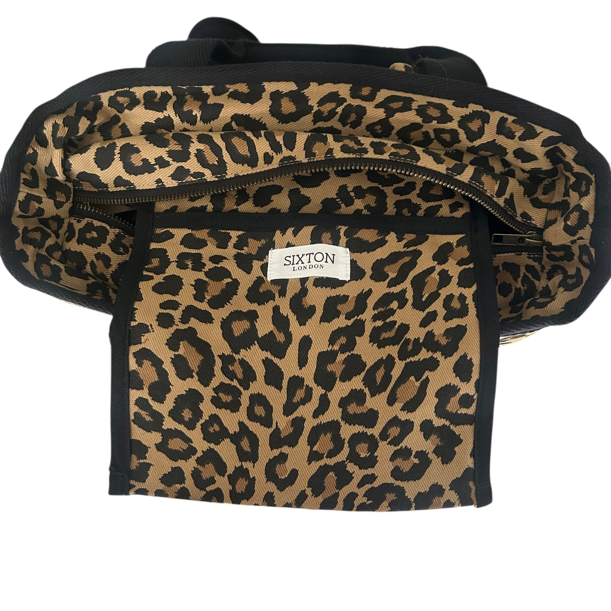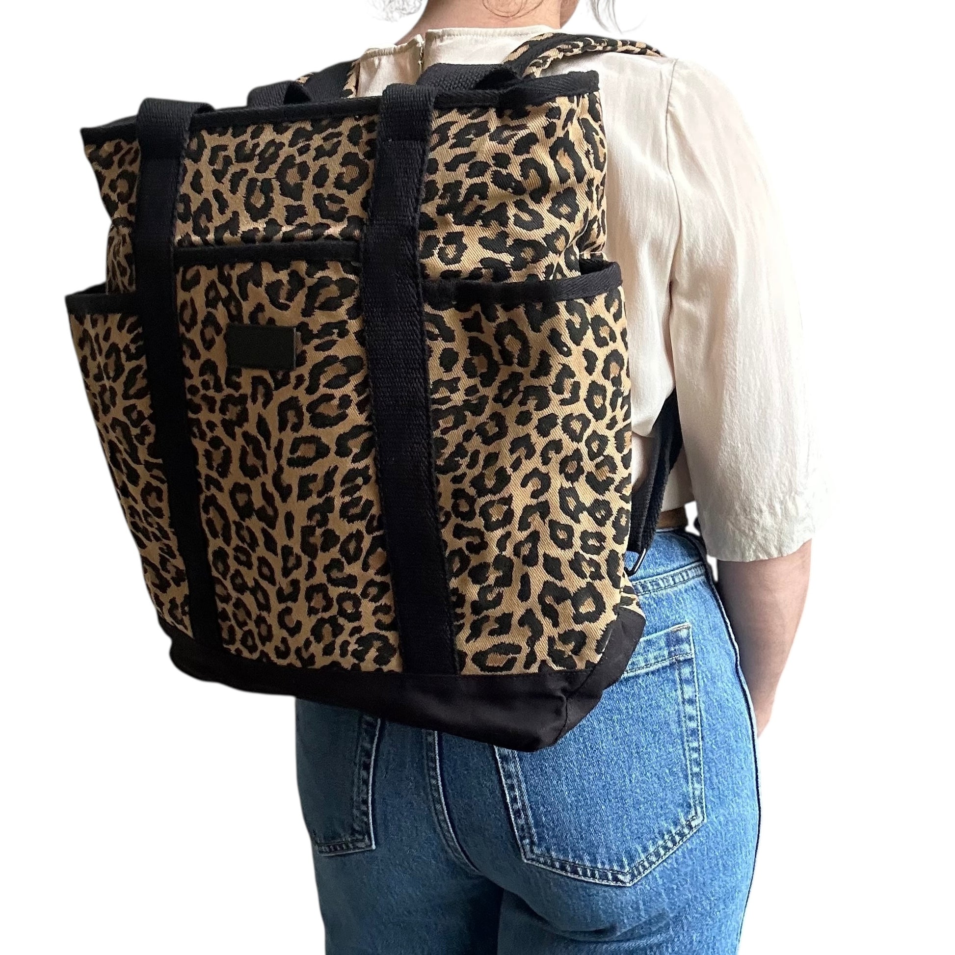 A statement backpack in a striking,sand leopard print, made from recycled cotton.