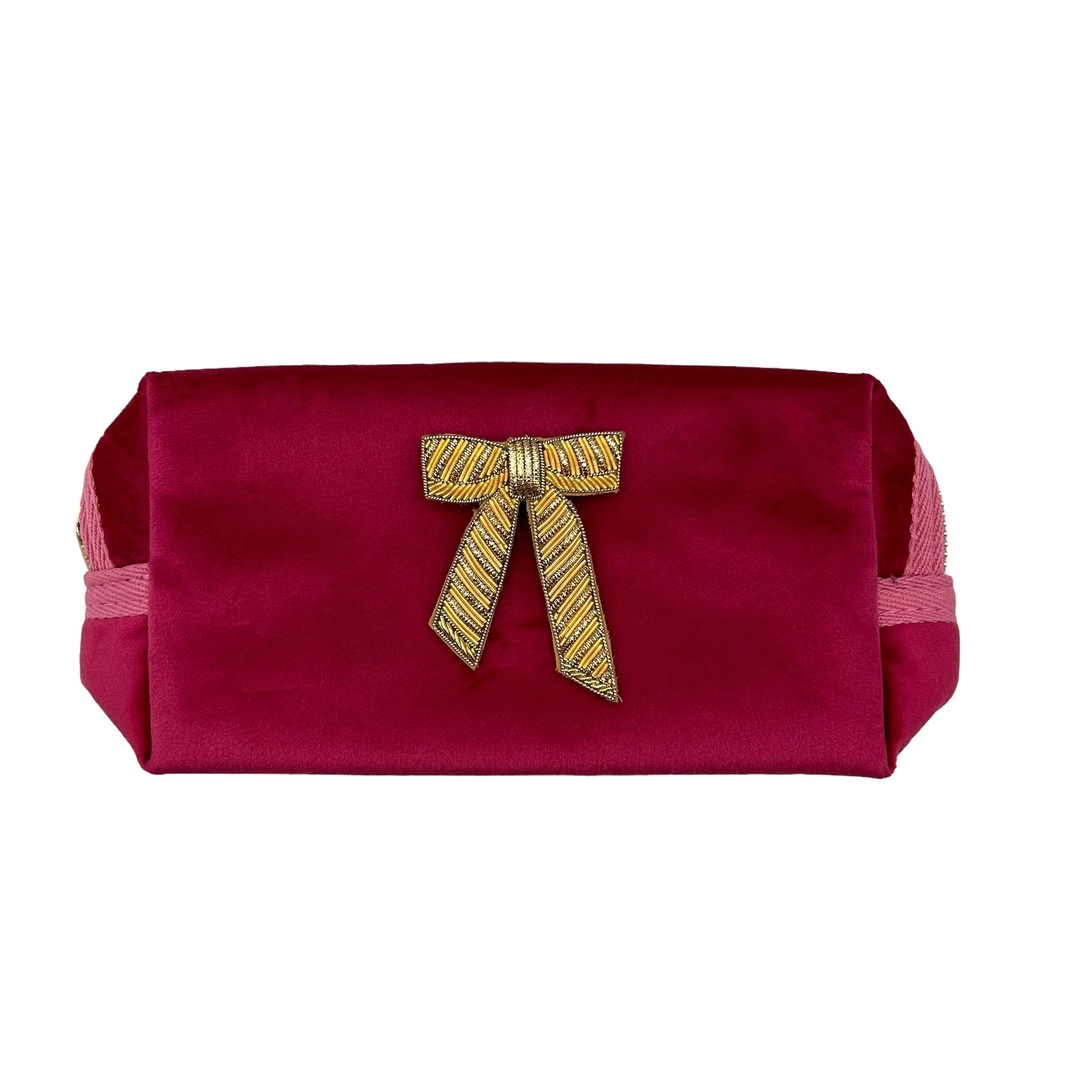 A gorgeous deep pink velvet makeup bag, with a detachable Gold Bow brooch.