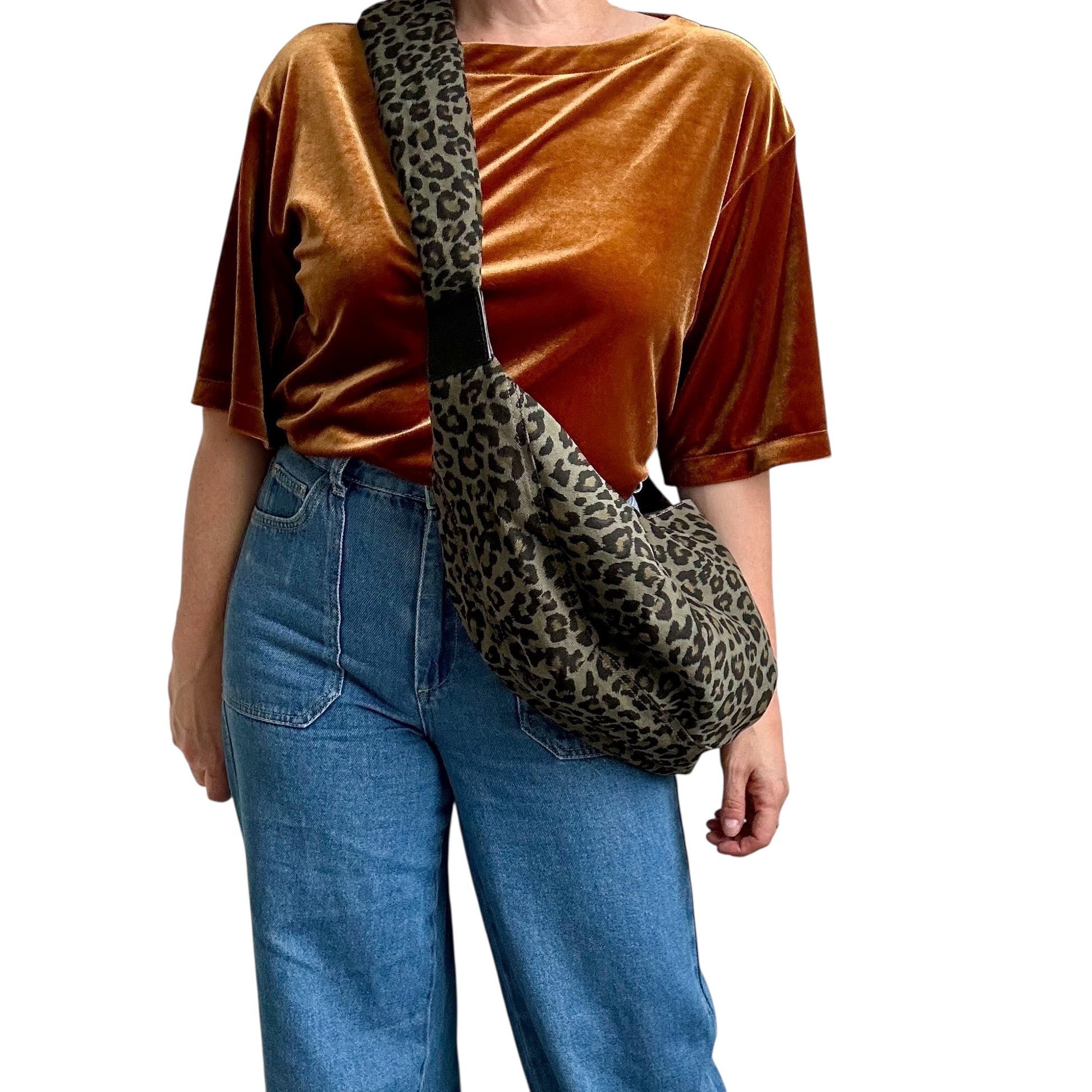 The Brixton bag - our best selling sling bag / cross body bag in a dark green leopard print, made from recycled cotton. Also available in small.