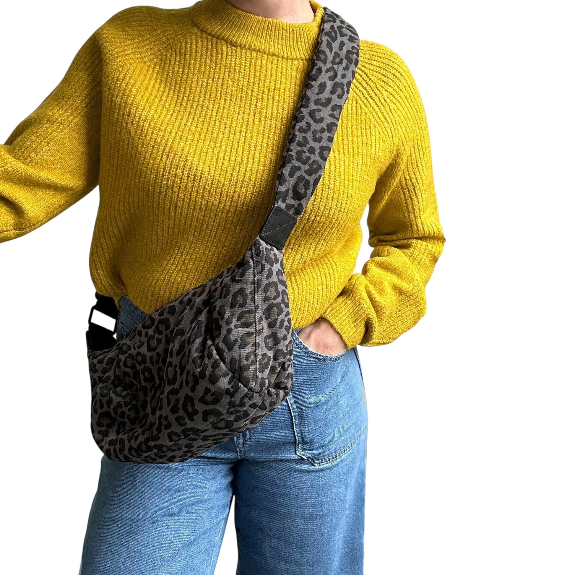 The Brixton bag - our best selling sling bag / cross body bag, in a lovely charcoal grey leopard print.