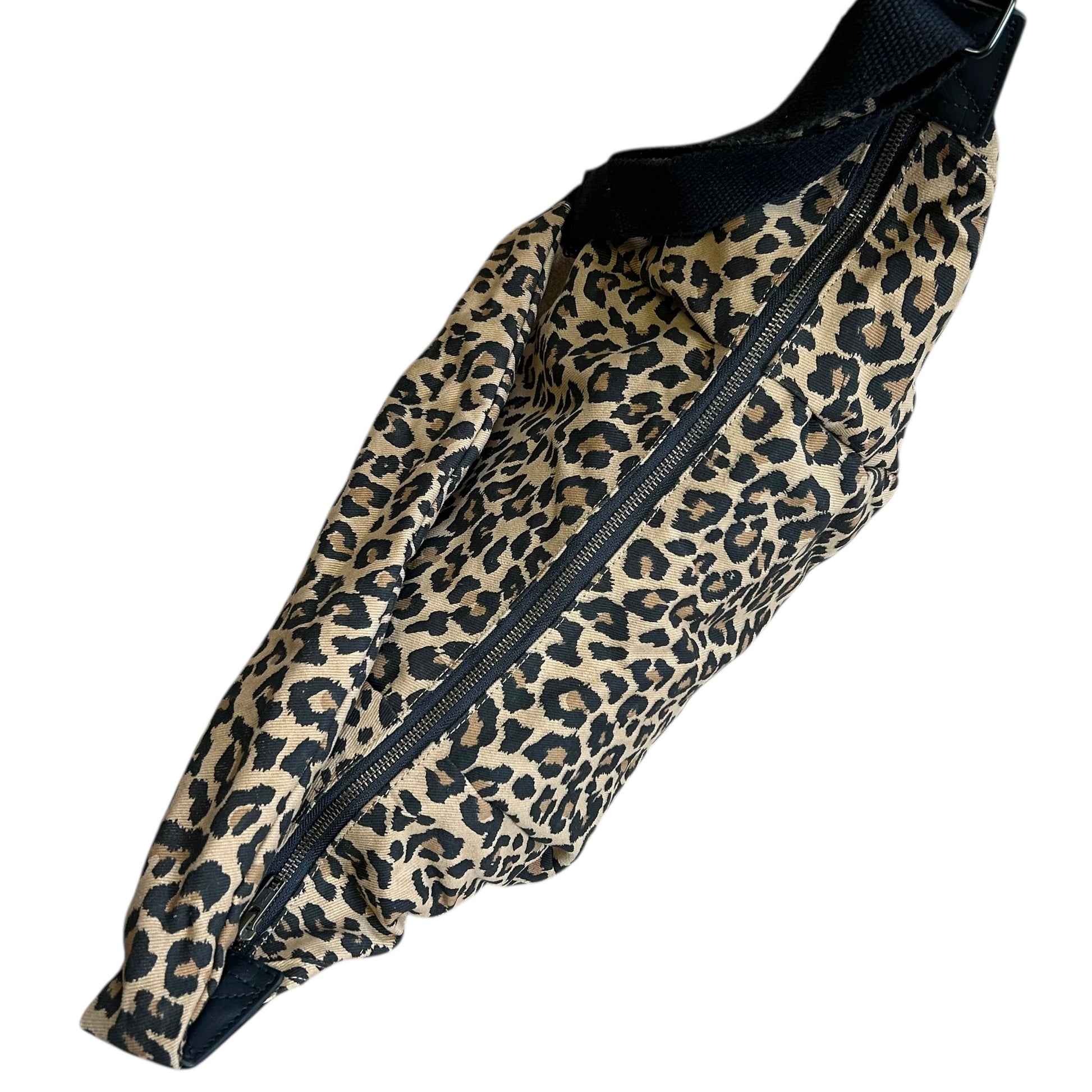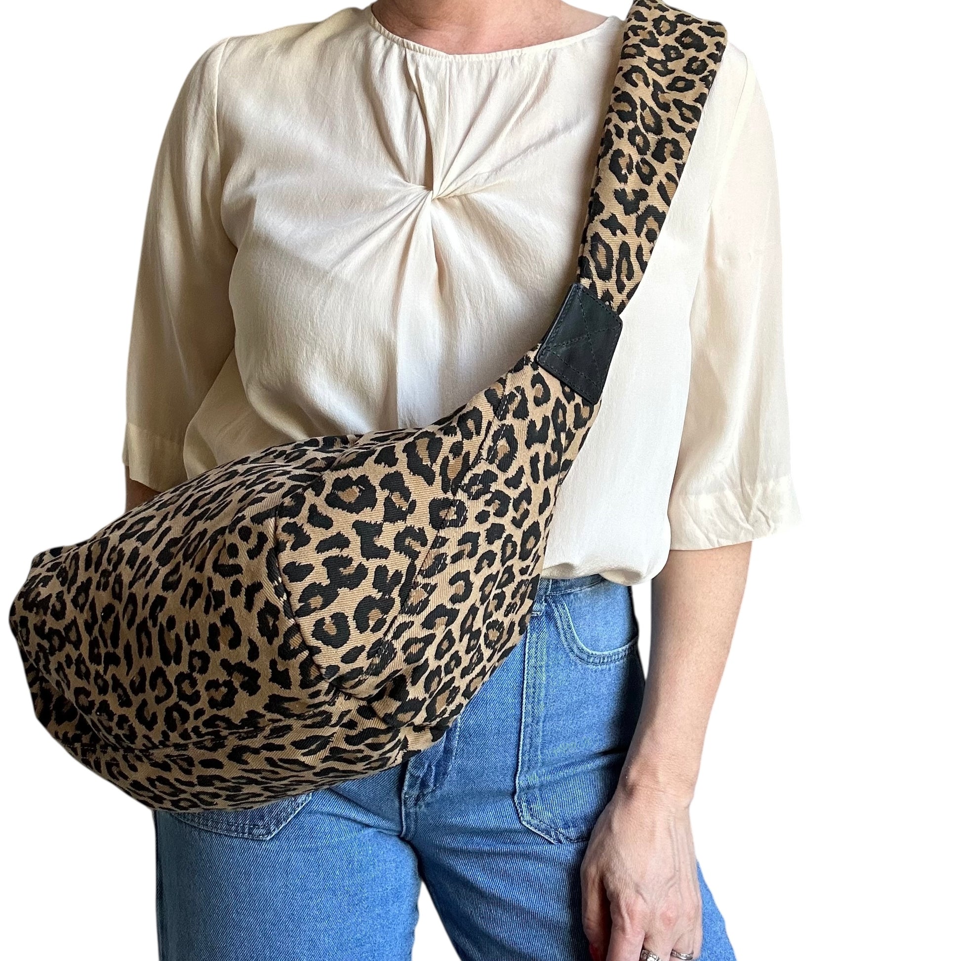 The Brixton bag - a stylish sling bag / cross body style bag in a lighter, sand coloured leopard print, made from recycled cotton. Also available in small.