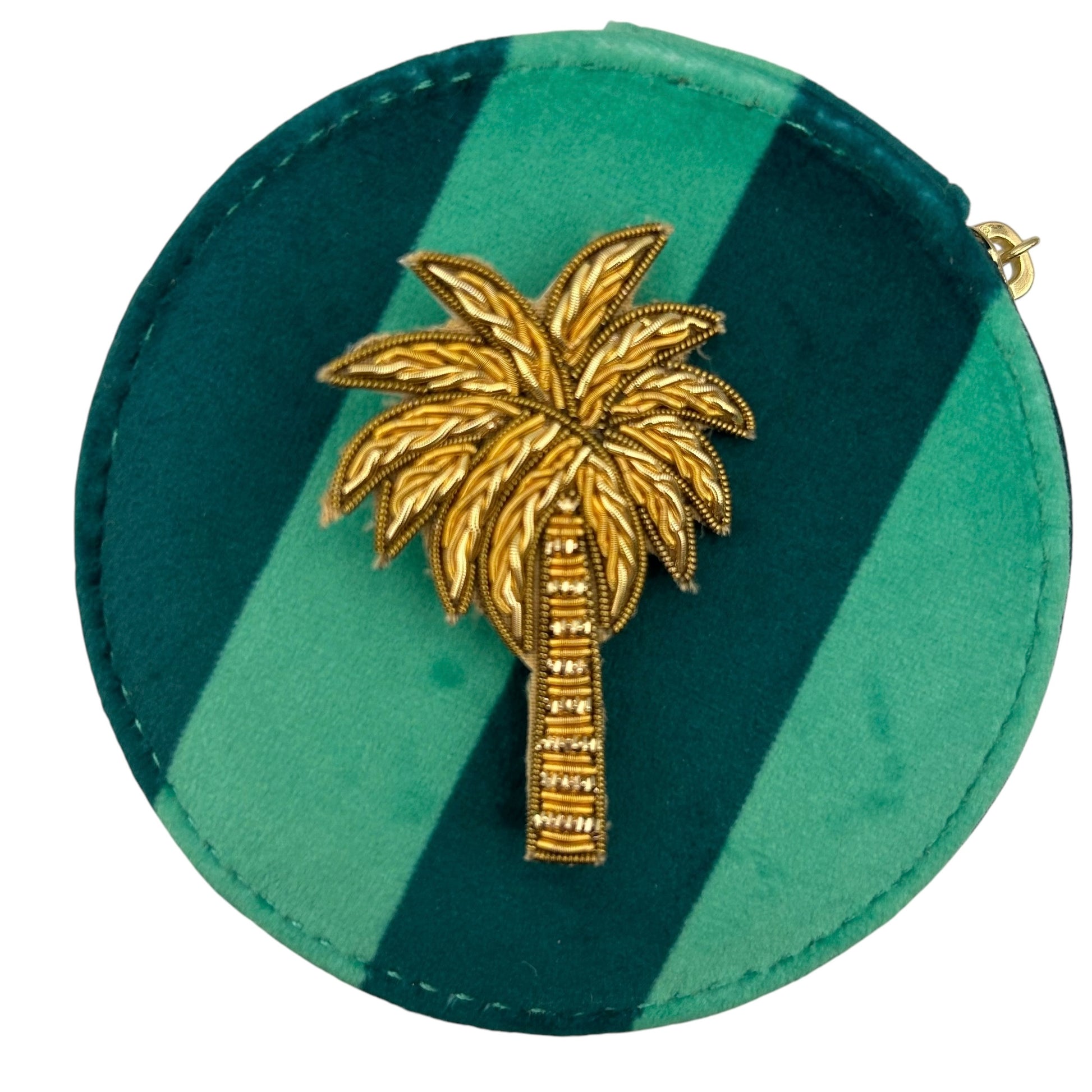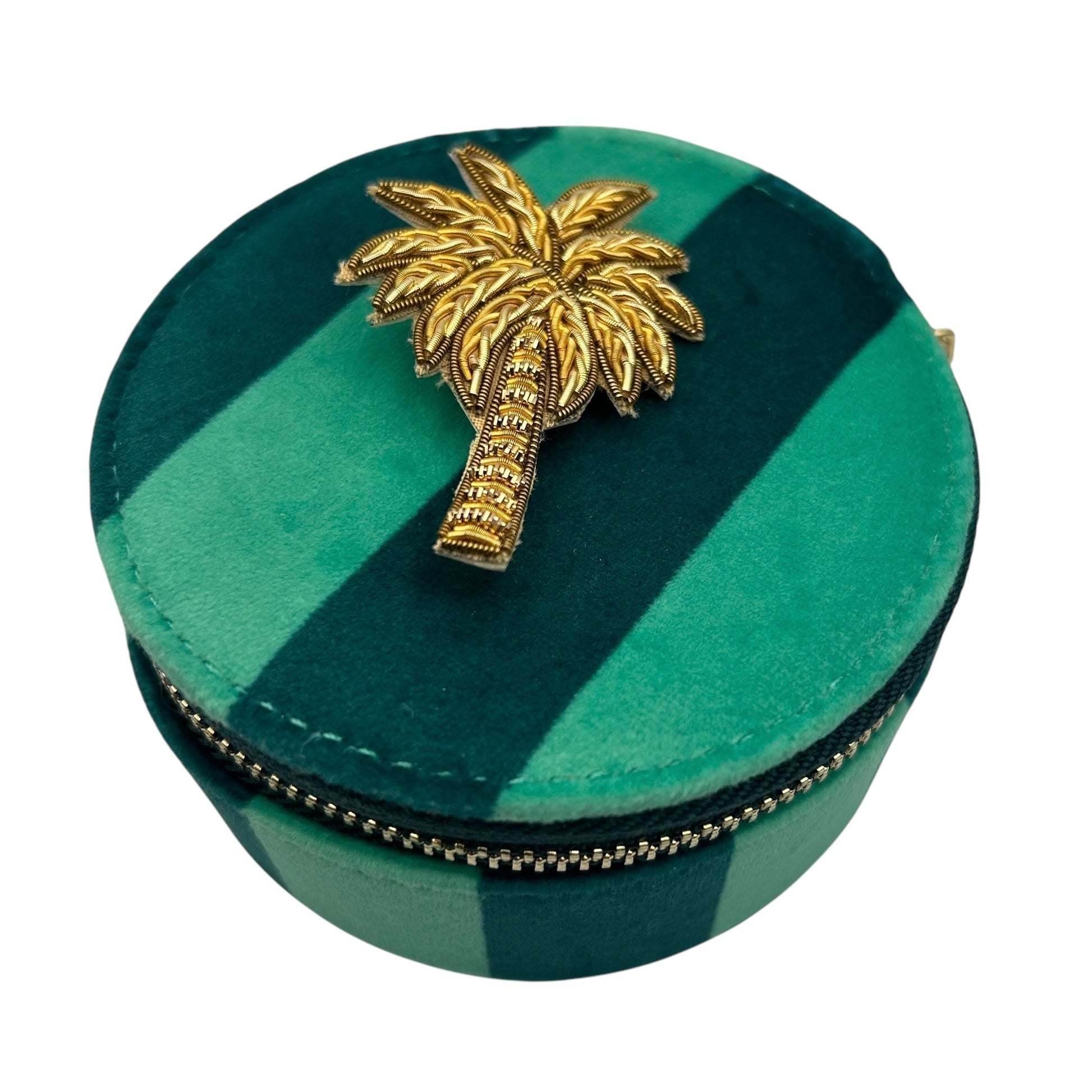 Jewellery Travel Pot in teal stripe - Palm Tree brooch