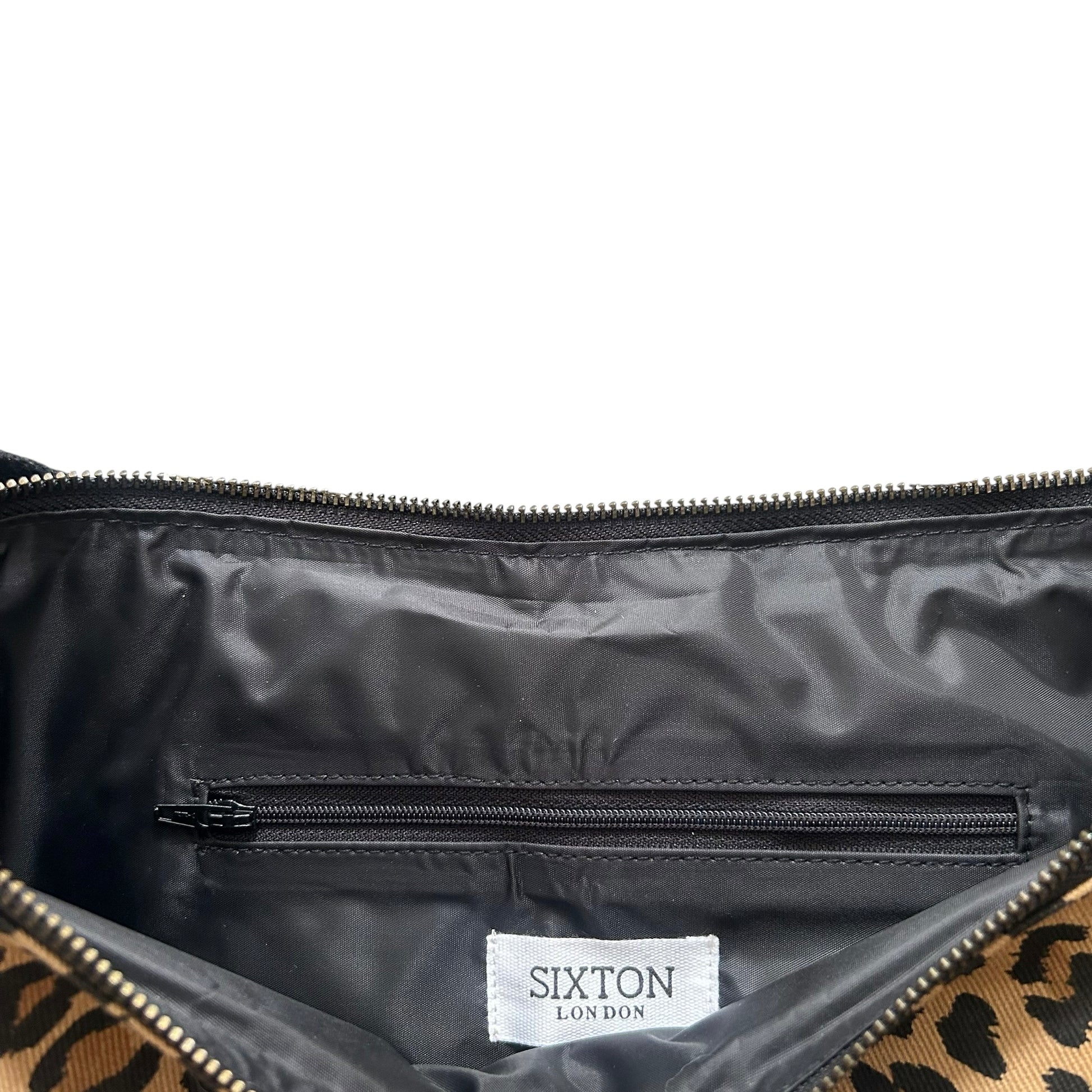 A messenger style bag in a neutral, sand leopard print. This bag features an extendable strap and can be worn across your body or over your shoulder. It has a main zip and a zipped interior pocket. The strap trim follows the shape of the bag all the way round.