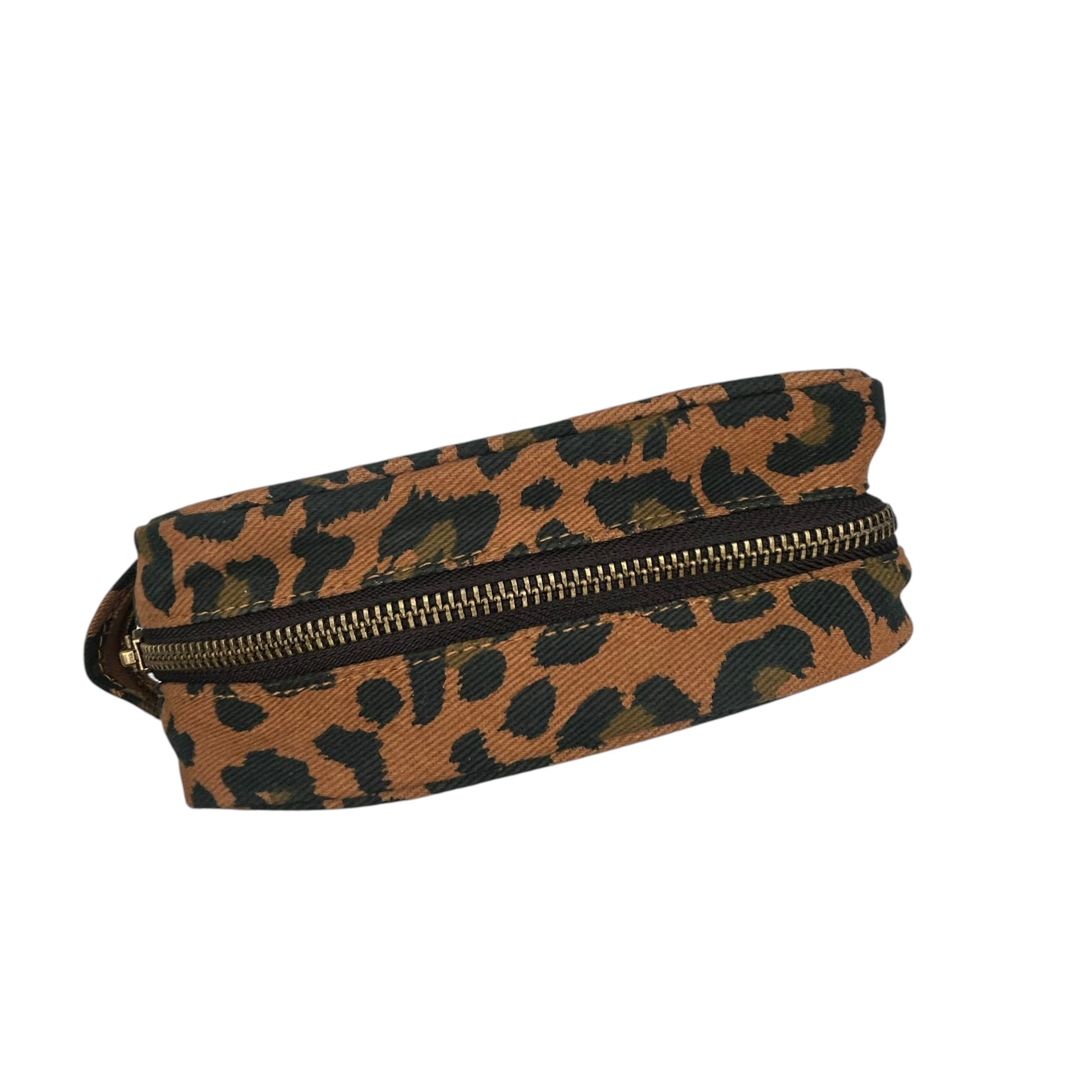 A stylish, small leopard print makeup bag made from cotton canvas.