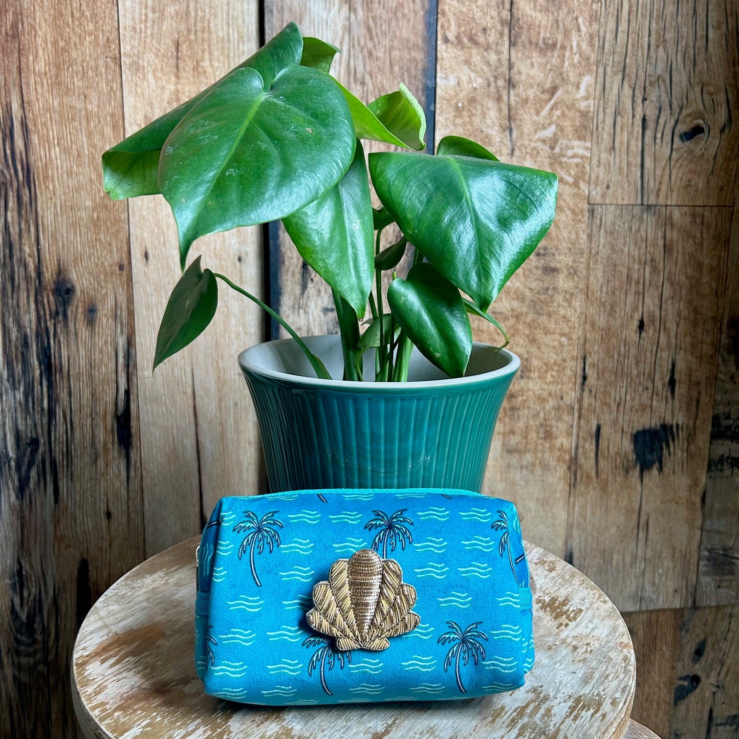 A gorgeous teal palm print velvet makeup bag, with a detachable Shell brooch.