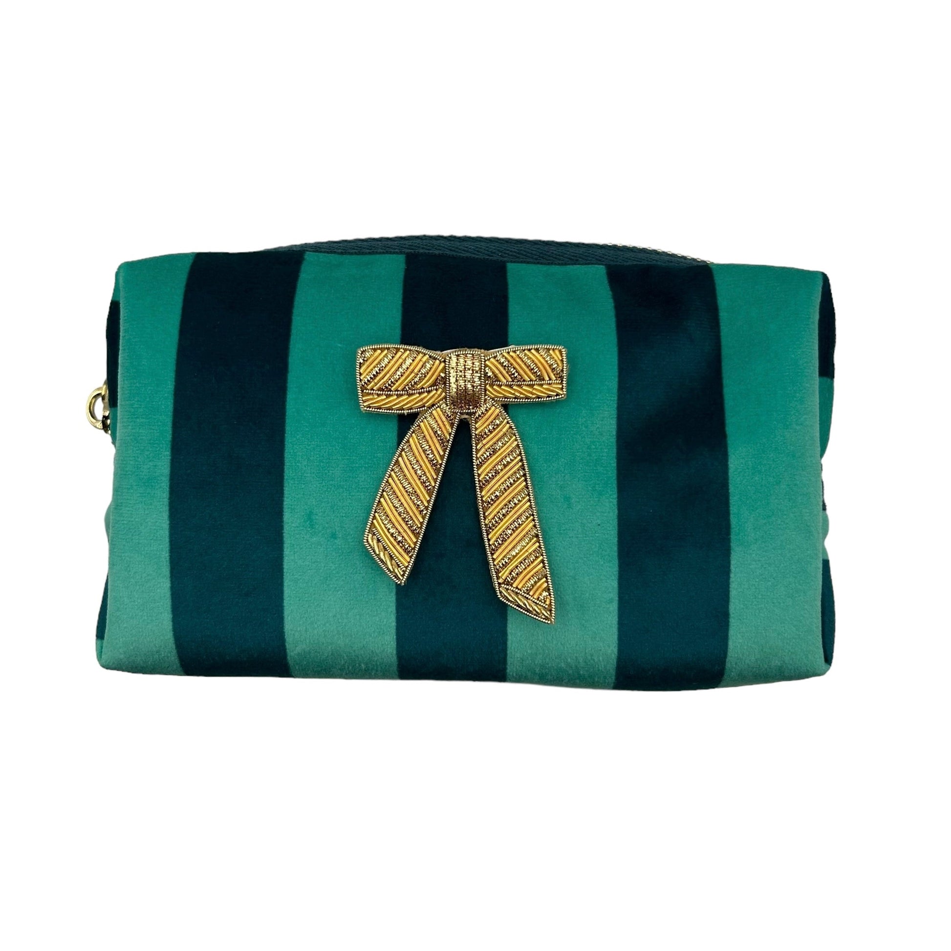 A gorgeous teal stripe velvet makeup bag, with a detachable Gold Bow brooch.