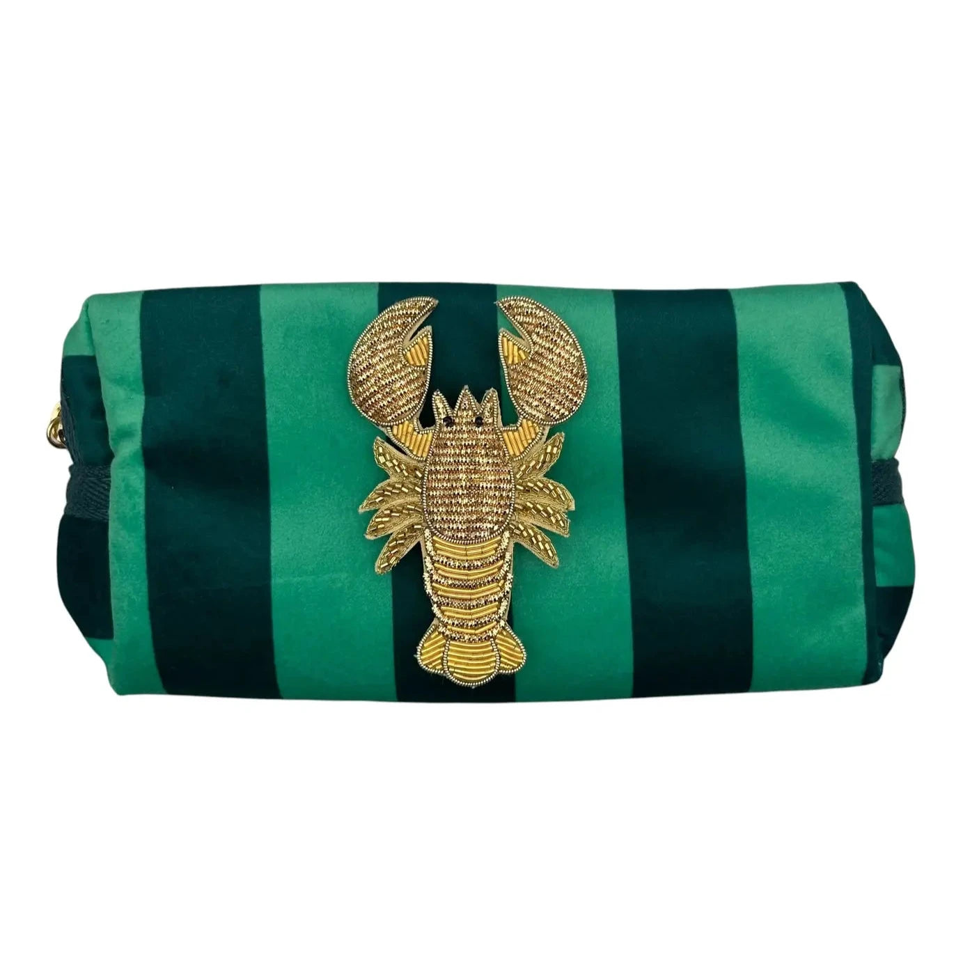 A gorgeous teal stripe velvet makeup bag, with our popular detachable Lobster brooch.