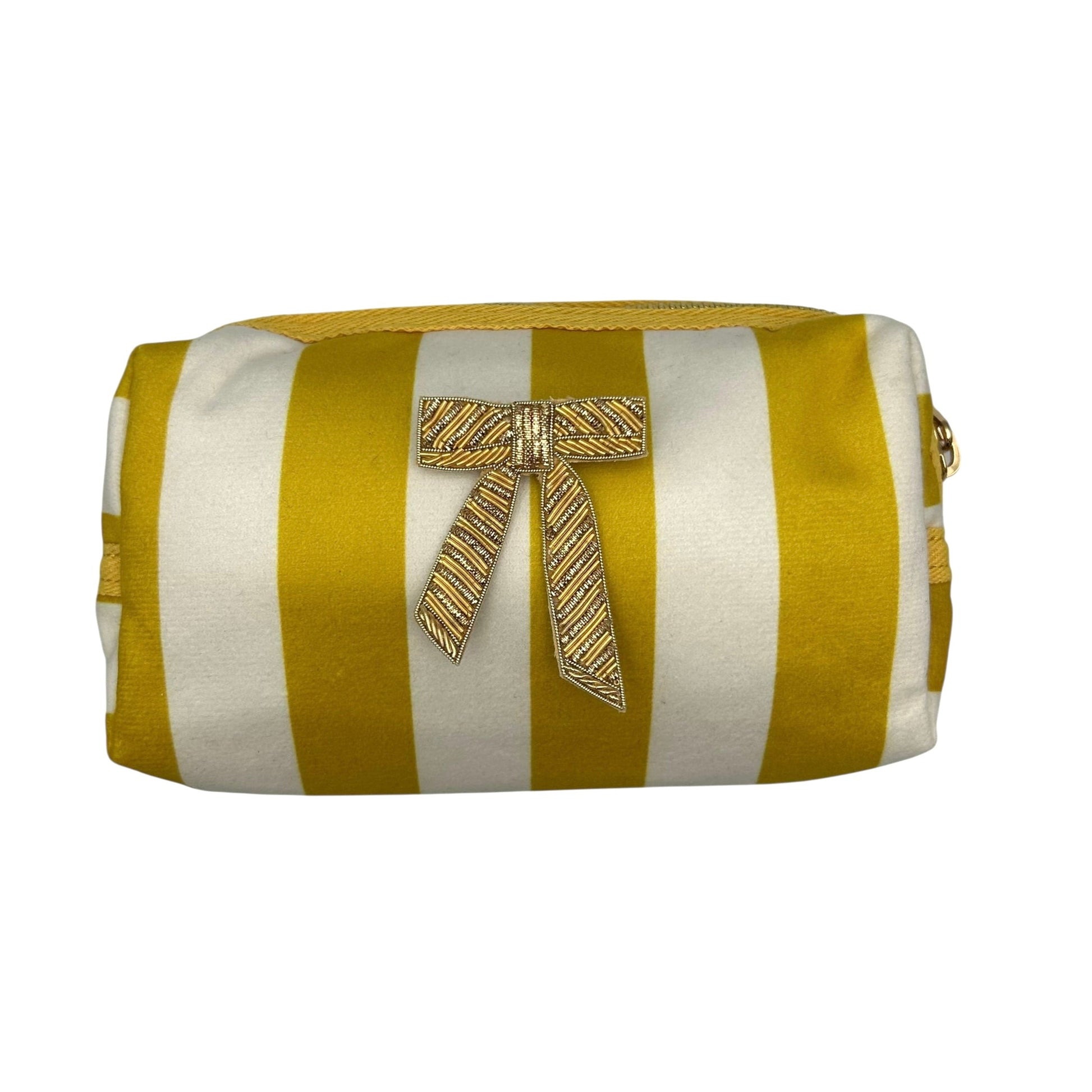 A gorgeous yellow and cream stripe velvet makeup bag, with a detachable Bow brooch.